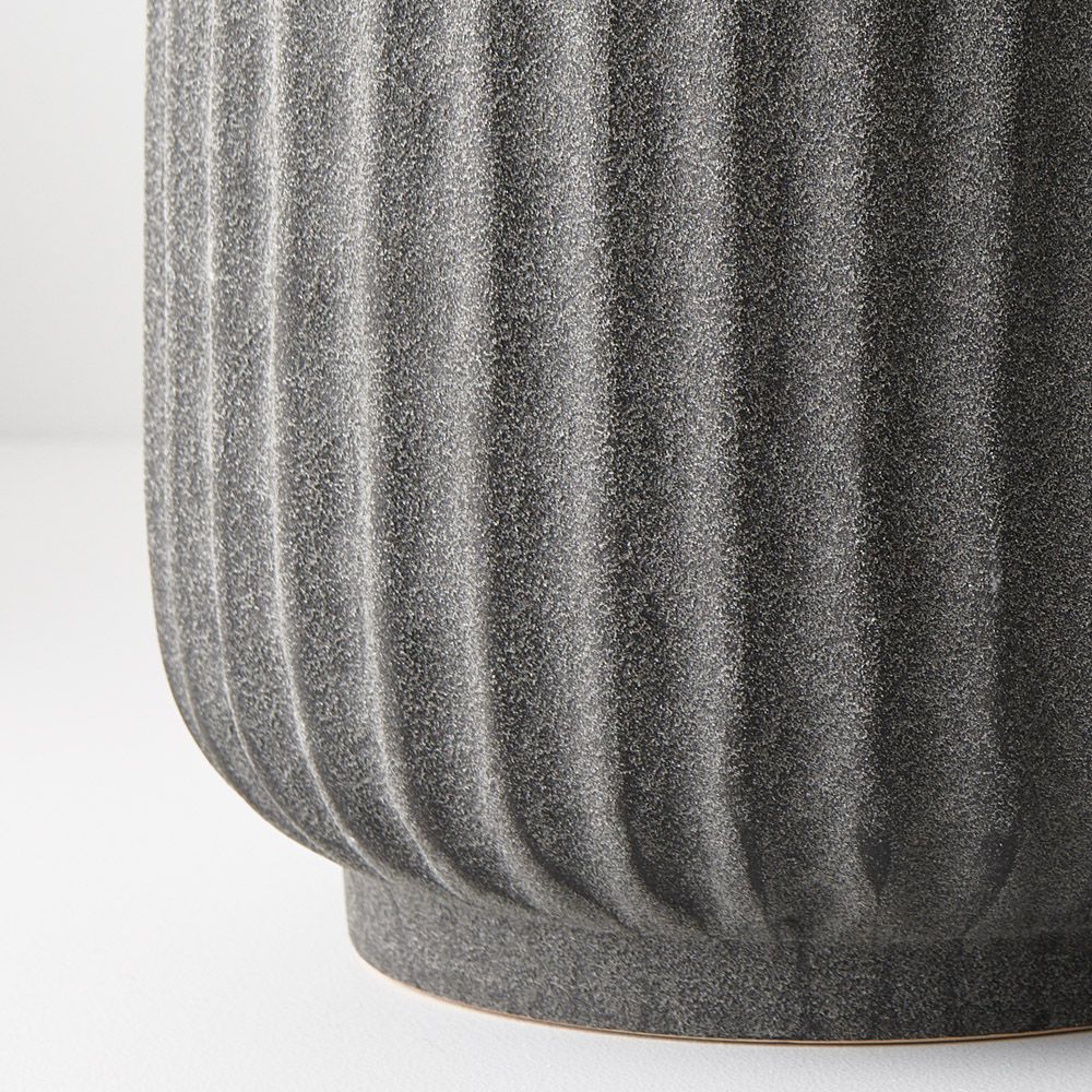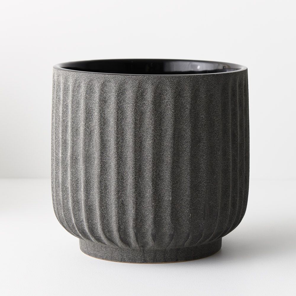 The Pilu Pot in black, measuring 19.5cm, showcases a distinct grooved design that adds texture and visual interest to its appearance. Its sleek yet eye-catching style makes it a versatile choice for housing plants or enhancing decor arrangements with a touch of modern flair.