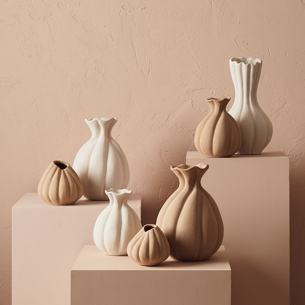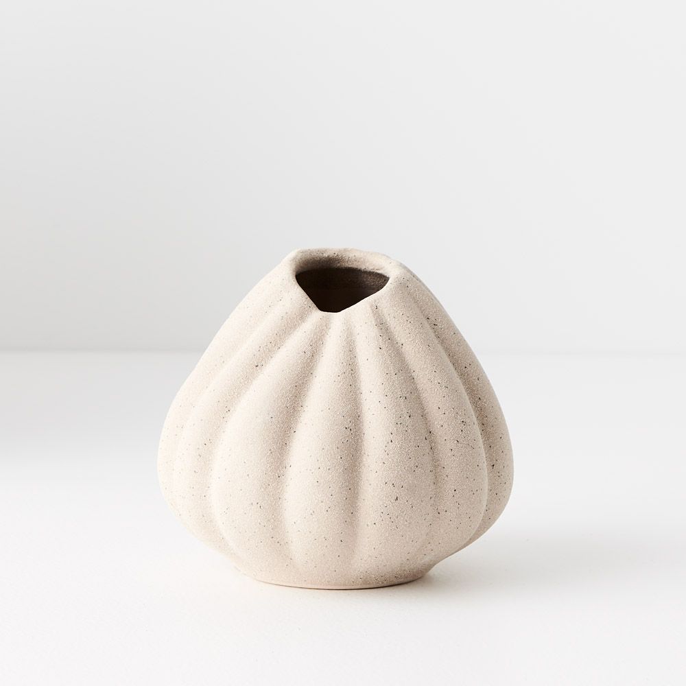 The Hana vase, with its petite, pod-like shape, shares a subtle elegance in ceramic. Its sand hue adds depth to any setting, offering a melancholic beauty that enhances minimalist décor or stands as a solitary statement piece. Note: These decorative vases do not come with a guarantee they will hold water.