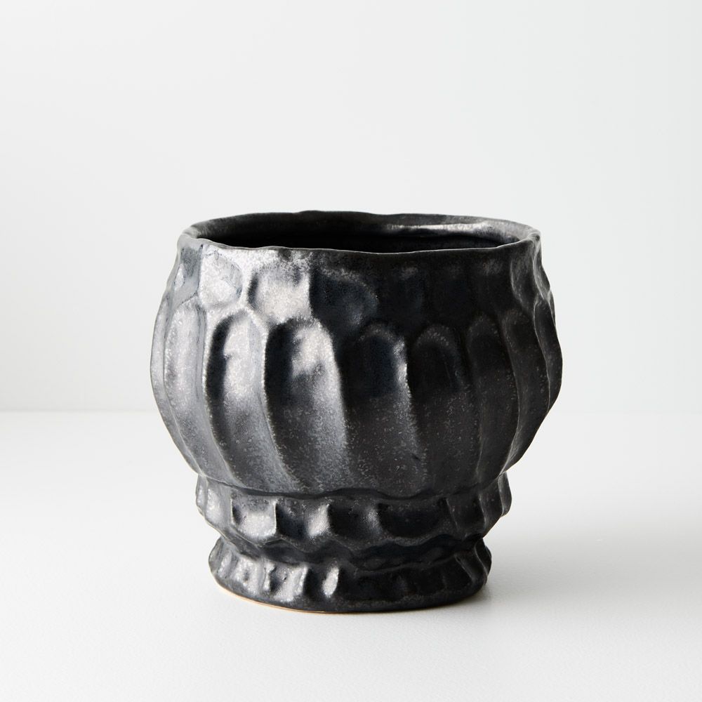 A charming small black pot, adorned with a distinctive indentation pattern, perfect for nurturing petite plants or delicate blossoms. Its elegant design adds a touch of sophistication to any space, marrying functionality with aesthetic allure.