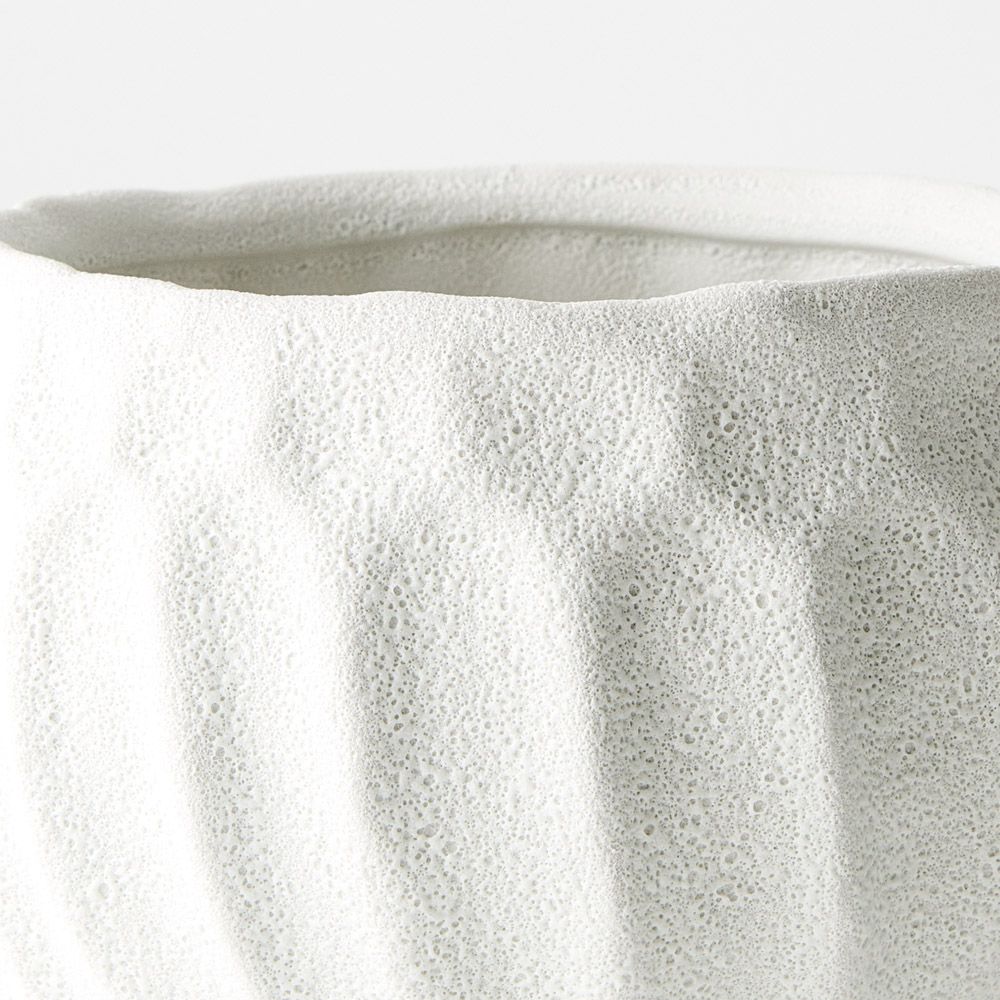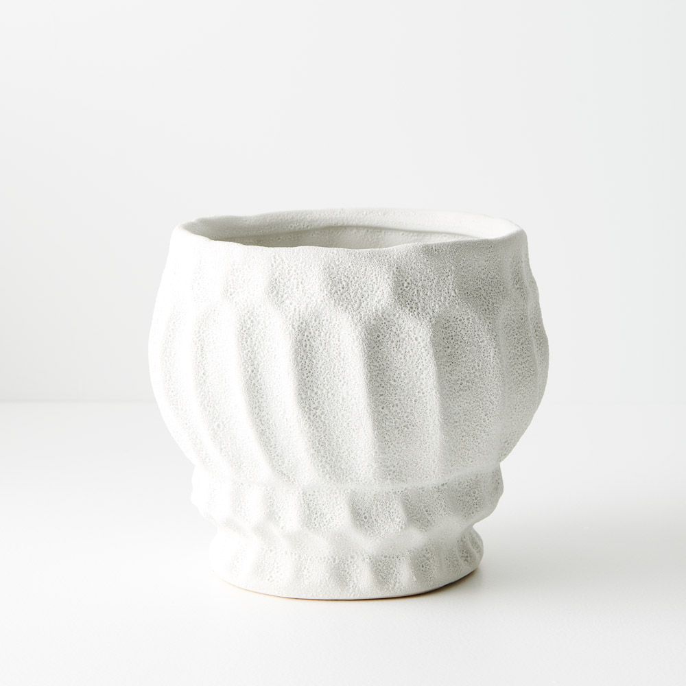 A charming small white pot, adorned with a distinctive indentation pattern, perfect for nurturing petite plants or delicate blossoms. Its elegant design adds a touch of sophistication to any space, marrying functionality with aesthetic allure.