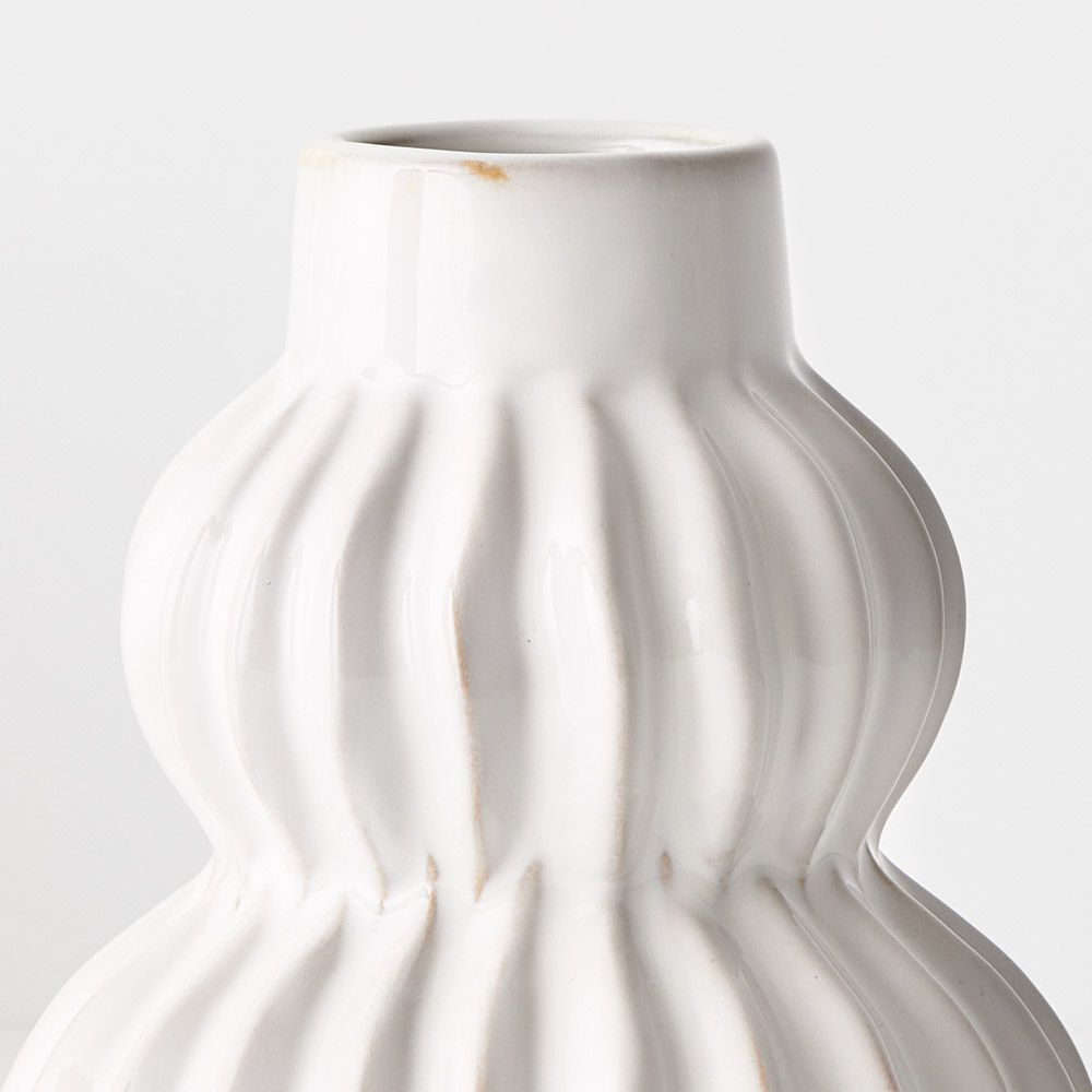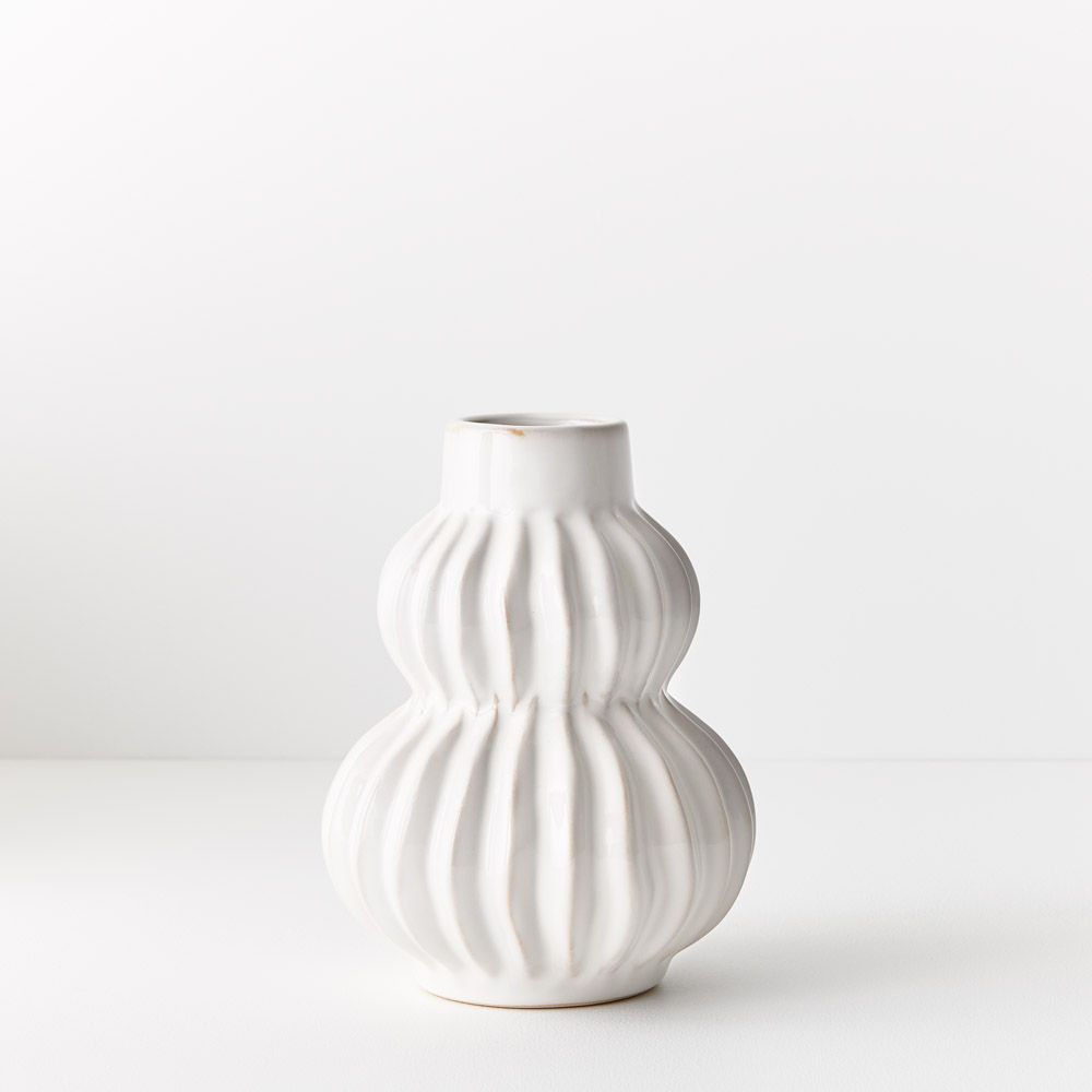 The Lulu Vase in White captivates with its intricate pleated detailing and whimsical bubble look. This charming combination adds a touch of elegance and playfulness to any space. Perfect for showcasing floral arrangements or as a standalone decorative piece, it brings a unique flair to your decor. Note: These decorative vases do not come with a guarantee they will hold water.
