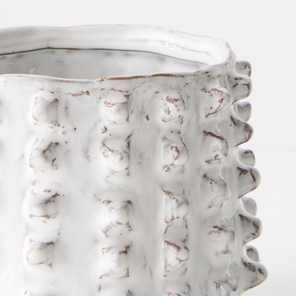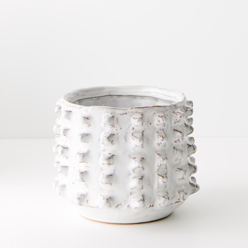 Pot Alya boasts unique nub-like details adorning its entire surface, adding character and texture to any space. Its distinctive design elevates your decor, making it a standout piece for showcasing plants or as a decorative accent. Alya's intricate features offer a touch of contemporary charm, perfect for adding depth and interest to your home or office. This product is the smaller of the two sizes.