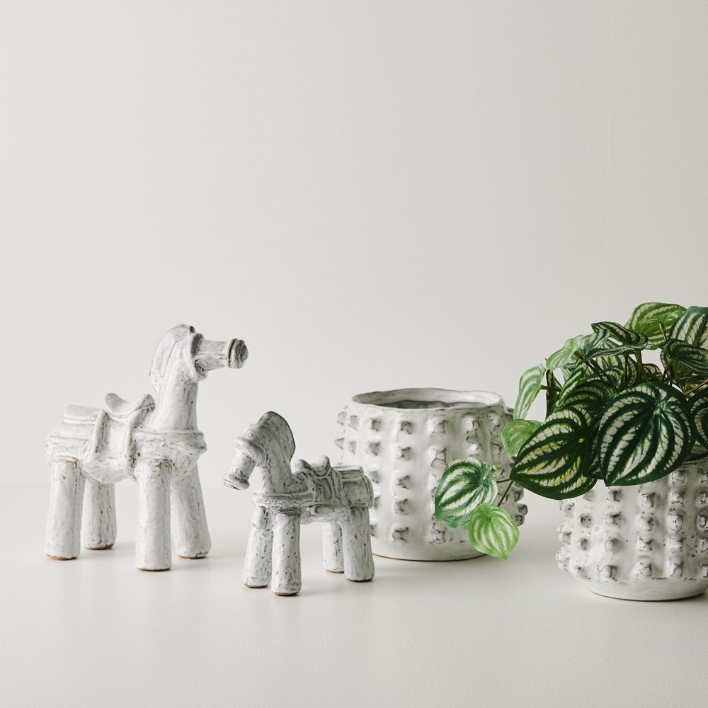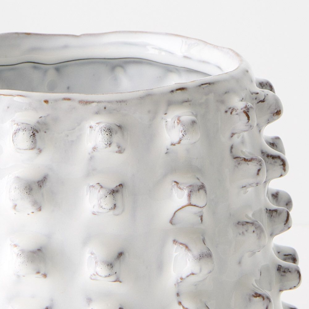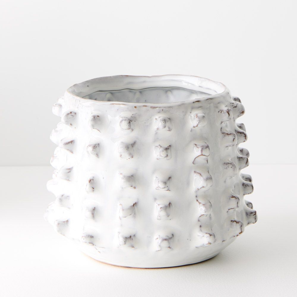 Pot Alya boasts unique nub-like details adorning its entire surface, adding character and texture to any space. Its distinctive design elevates your decor, making it a standout piece for showcasing plants or as a decorative accent. Alya's intricate features offer a touch of contemporary charm, perfect for adding depth and interest to your home or office. This product is the larger of the two sizes.