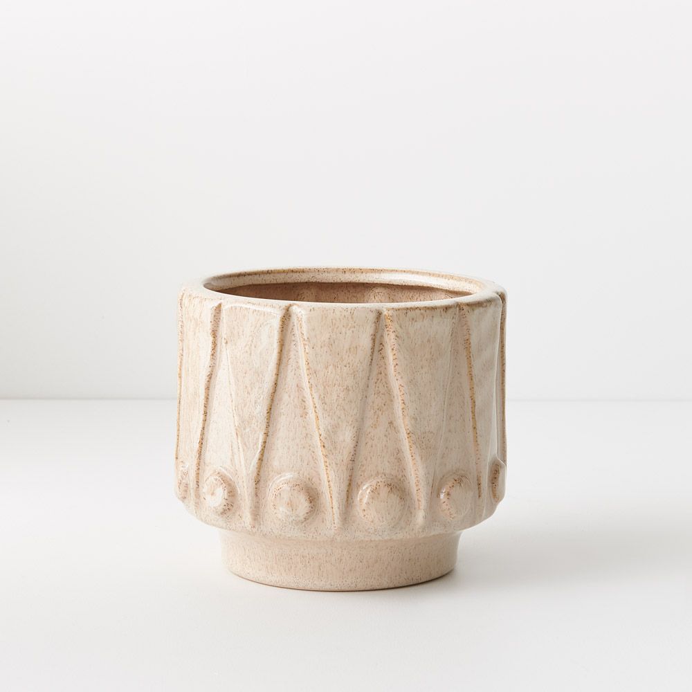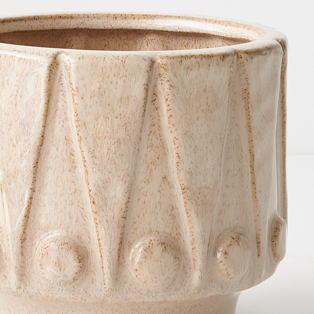 The Jadelo Pot, adorned in a rich nougat hue, showcases captivating geometric patterns. Its intricate design adds depth and character to any space, making it a stylish vessel for plants or a standalone decorative piece, infusing interiors with modern elegance and charm.