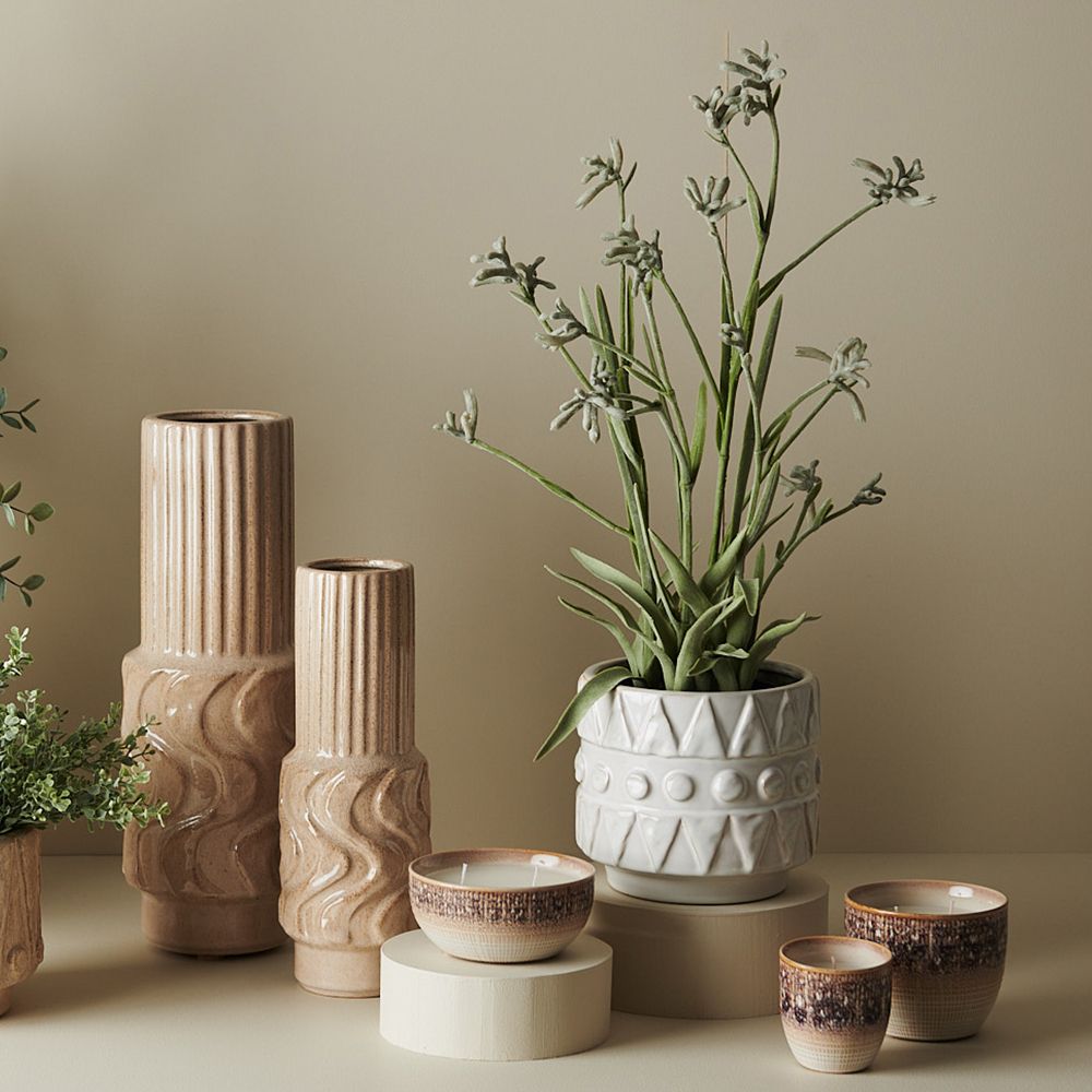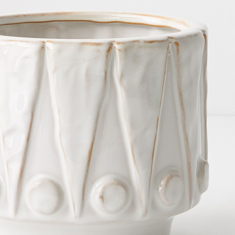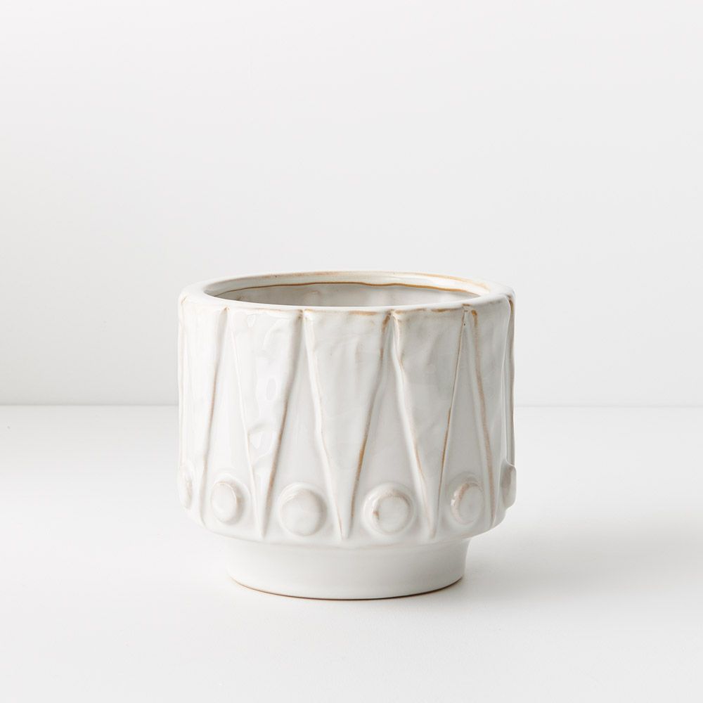 The Jadelo Pot, adorned in white, showcases captivating geometric patterns. Its intricate design adds depth and character to any space, making it a stylish vessel for plants or a standalone decorative piece, infusing interiors with modern elegance and charm.