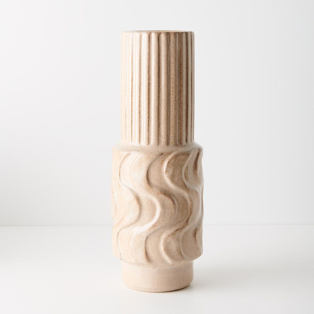 Introducing the Vase Jadelo in nougat, this product is the larger of the two sizes. a striking piece of geometric elegance. Tall and thin, its intricate pattern adds a touch of sophistication to any space. Crafted to enhance floral arrangements or stand alone as a statement piece, the Vase Jadelo exudes timeless charm and contemporary style.
