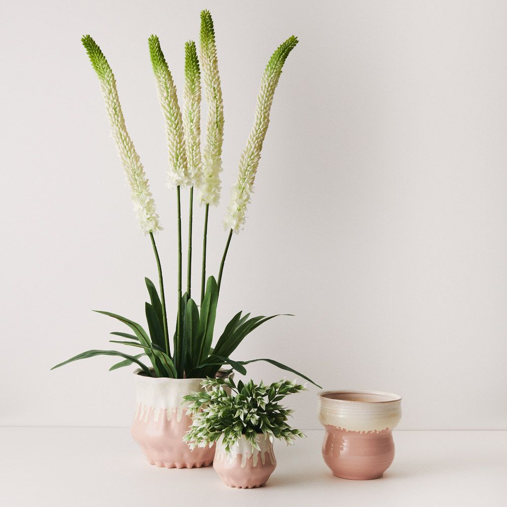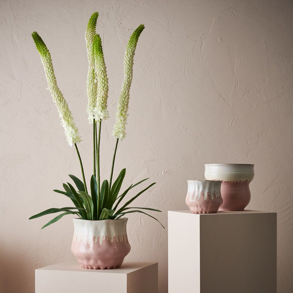 The Jesse Pot exhibits a charming blend of white and pink hues seamlessly merging into a delightful, glazed finish. Ideal for small plants and arrangements, its unique design adds a touch of elegance to any space, making it a perfect choice for both botanical displays and decorative accents.