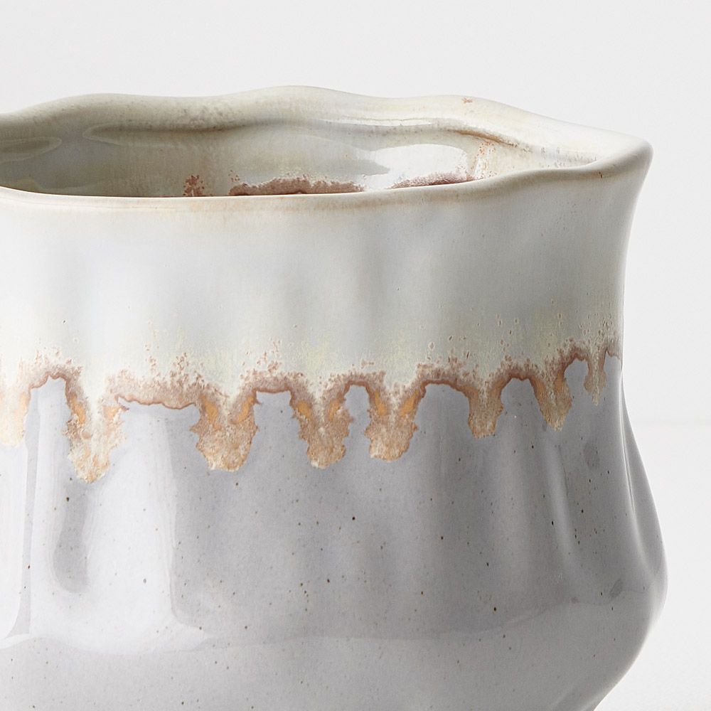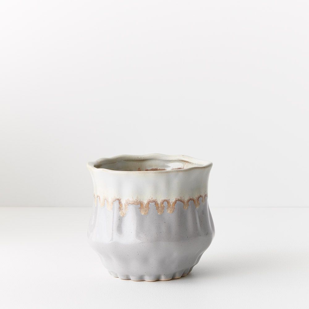 The Jesse Pot exhibits a charming blend of white and sky-blue hues seamlessly merging into a delightful, glazed finish. Ideal for small plants and arrangements, its unique design adds a touch of elegance to any space, making it a perfect choice for both botanical displays and decorative accents.