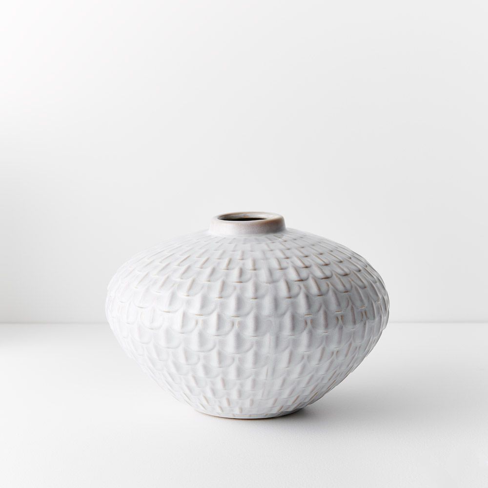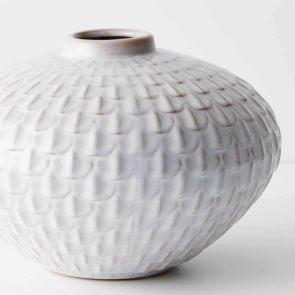 The Josie Pot in White radiates charm with its pink hue and intricate scale-like pattern. Ideal for holding medium-sized plants or as a standalone decorative piece, its unique design adds a touch of whimsy and elegance to any interior setting, making it a delightful addition to your decor collection.