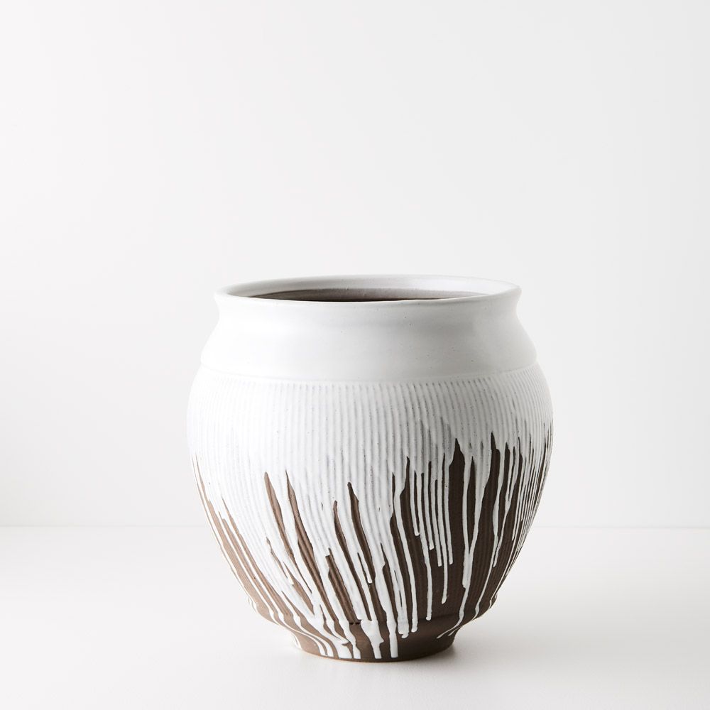 Introducing Pot Piedada, a striking brown pot adorned with captivating white paint drips flowing from the opening down to the base. This distinctive design adds a touch of artistic flair to any space, making it a standout piece for showcasing plants or as a decorative accent. Embrace the unique fusion of colour and texture with Pot Piedada, an eye-catching addition to your home decor.