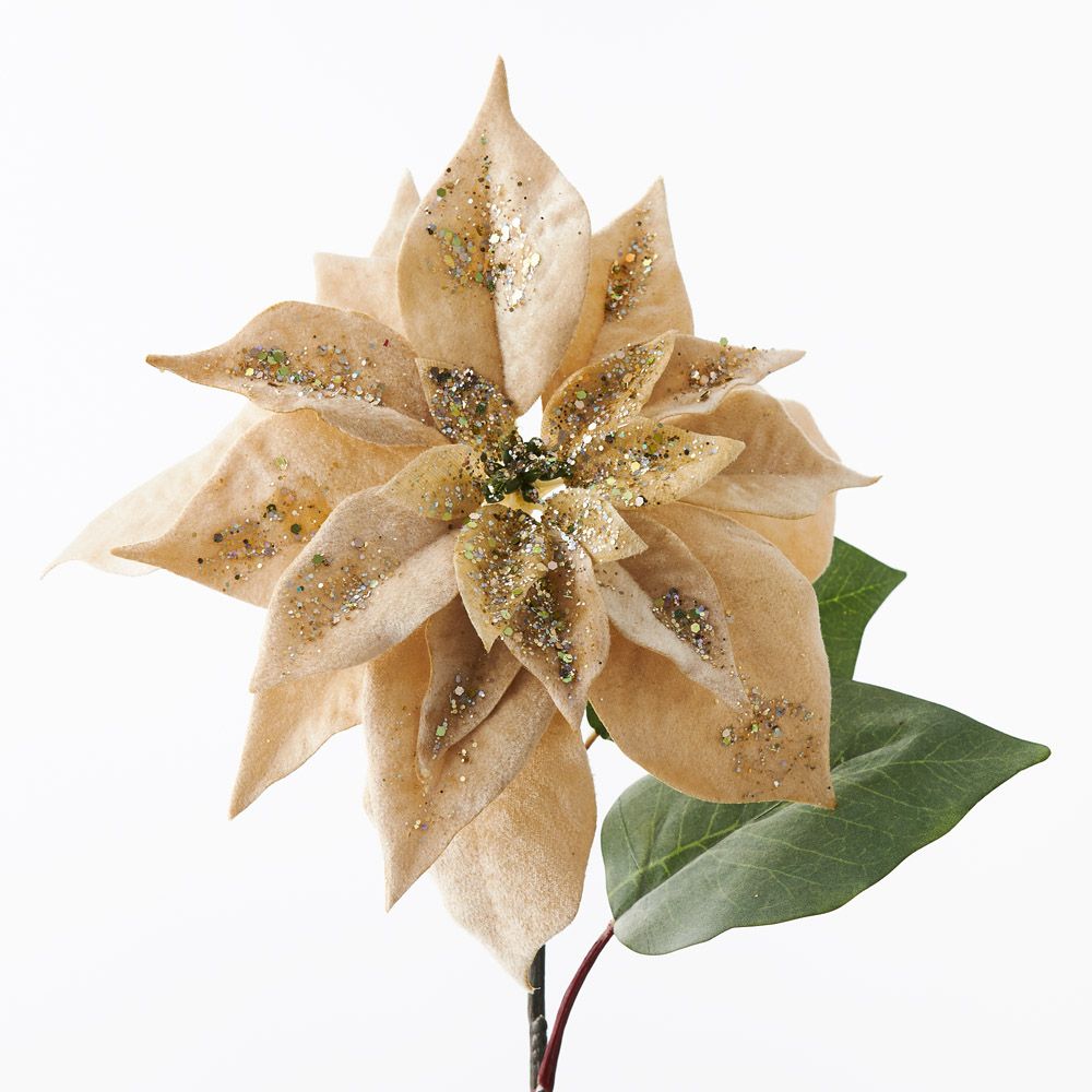 Presenting our Champagne Velvet Poinsettia for a truly enchanting Christmas. Crafted with luxurious velvet petals and adorned with glitter finishes, each bloom embodies festive elegance, adding a touch of holiday magic to your decor.