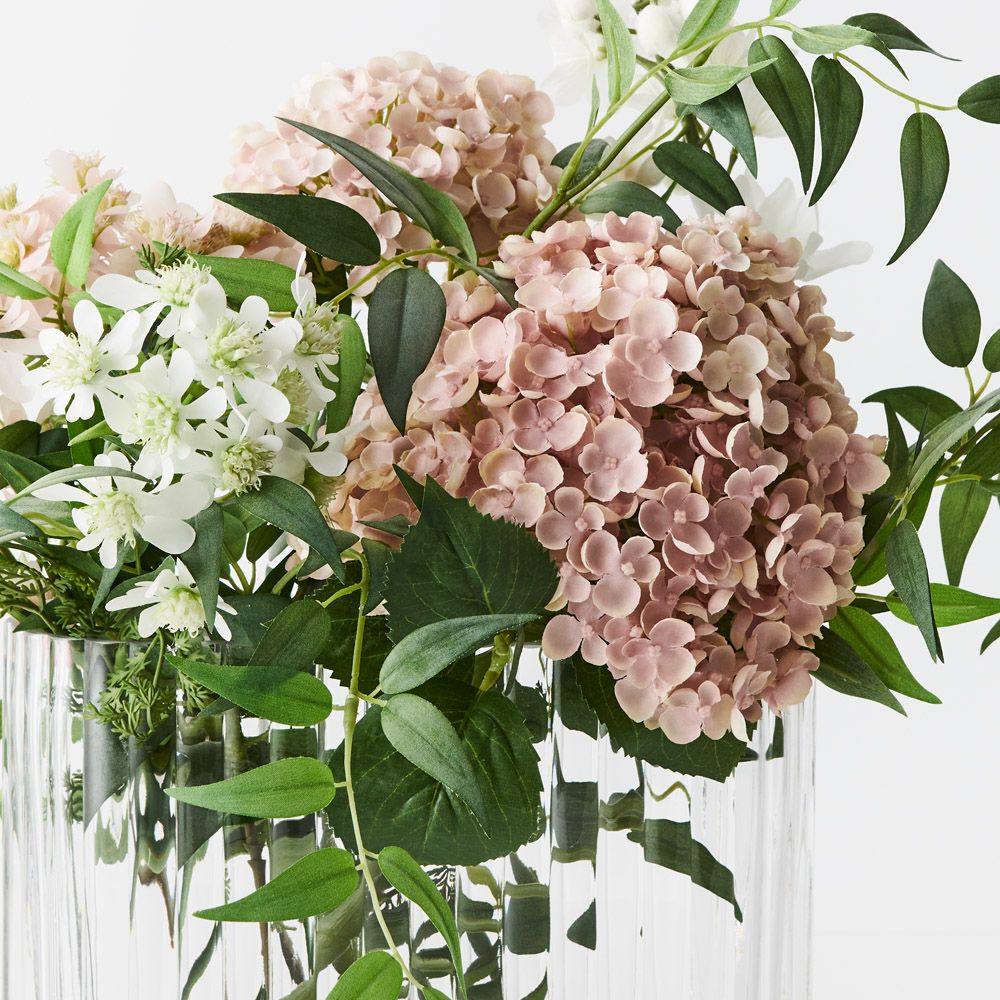 Embrace the enchanting blend of hues with our Hydrangea Delphinium Mix in a glass oval-shaped ripple vase. Soft petals of hydrangeas and delphiniums harmonise in a mesmerising dance, offering a captivating centrepiece that infuses elegance and tranquillity into any space.