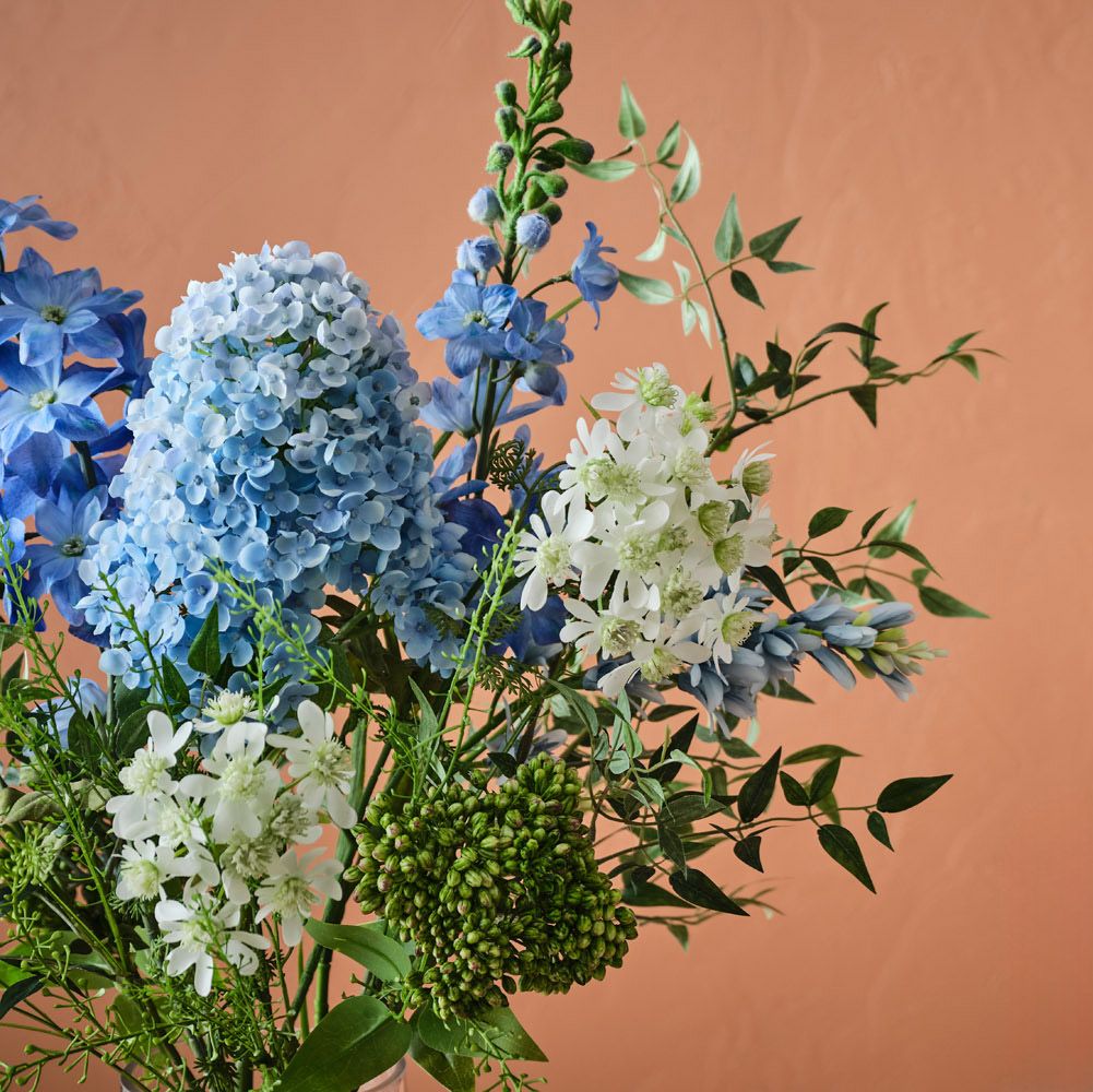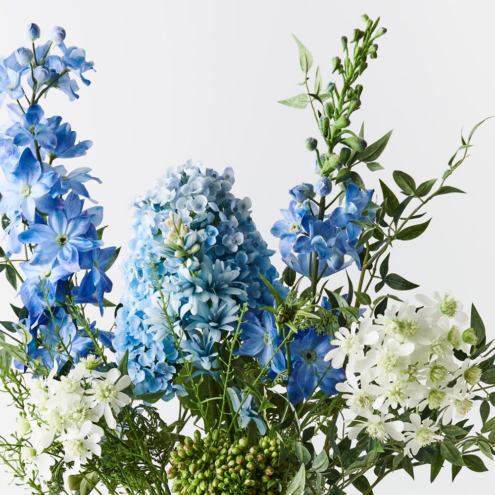 Elevate your space with the serene beauty of our Hydrangea Delphinium Mix in Vase, featuring a harmonious blend of blue and white blooms. Set in a tall glass vase, this elegant arrangement exudes sophistication, adding a touch of tranquillity to any room.