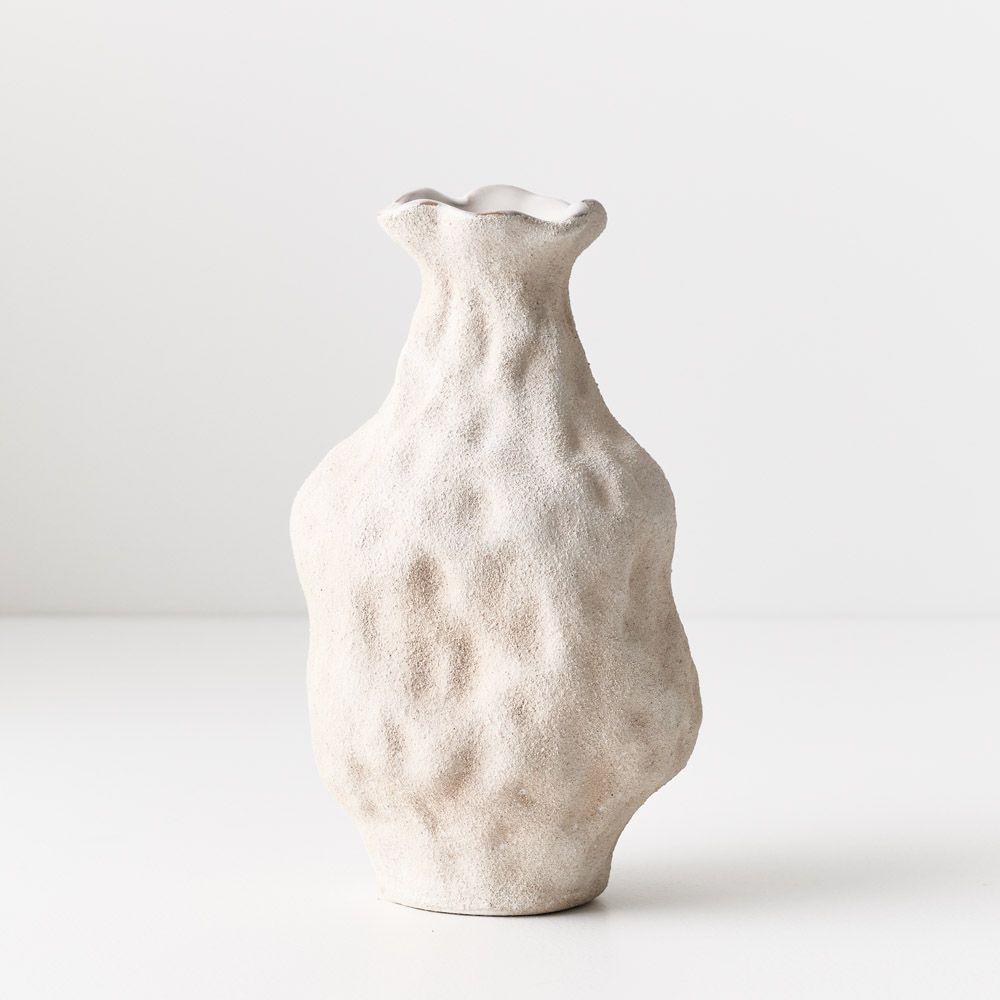 Vase Lexi is a textured ceramic piece with an organic shape, it has small indentation detail that add unique character. Handmade with a narrow opening, perfect as a decorative item or for showcasing a single stem. This exquisite vase brings a touch of rustic elegance to any space.