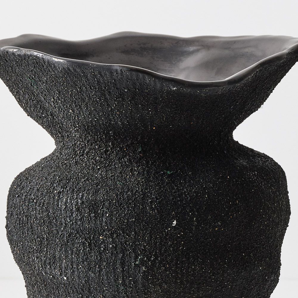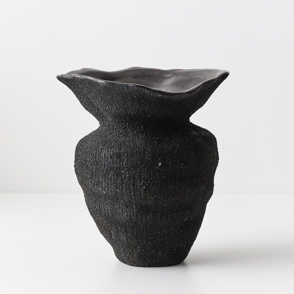 This ceramic pot starts with a common shape but is finished with an oversized collar, making it a standout talking piece. Its textured surface adds to its unique charm.