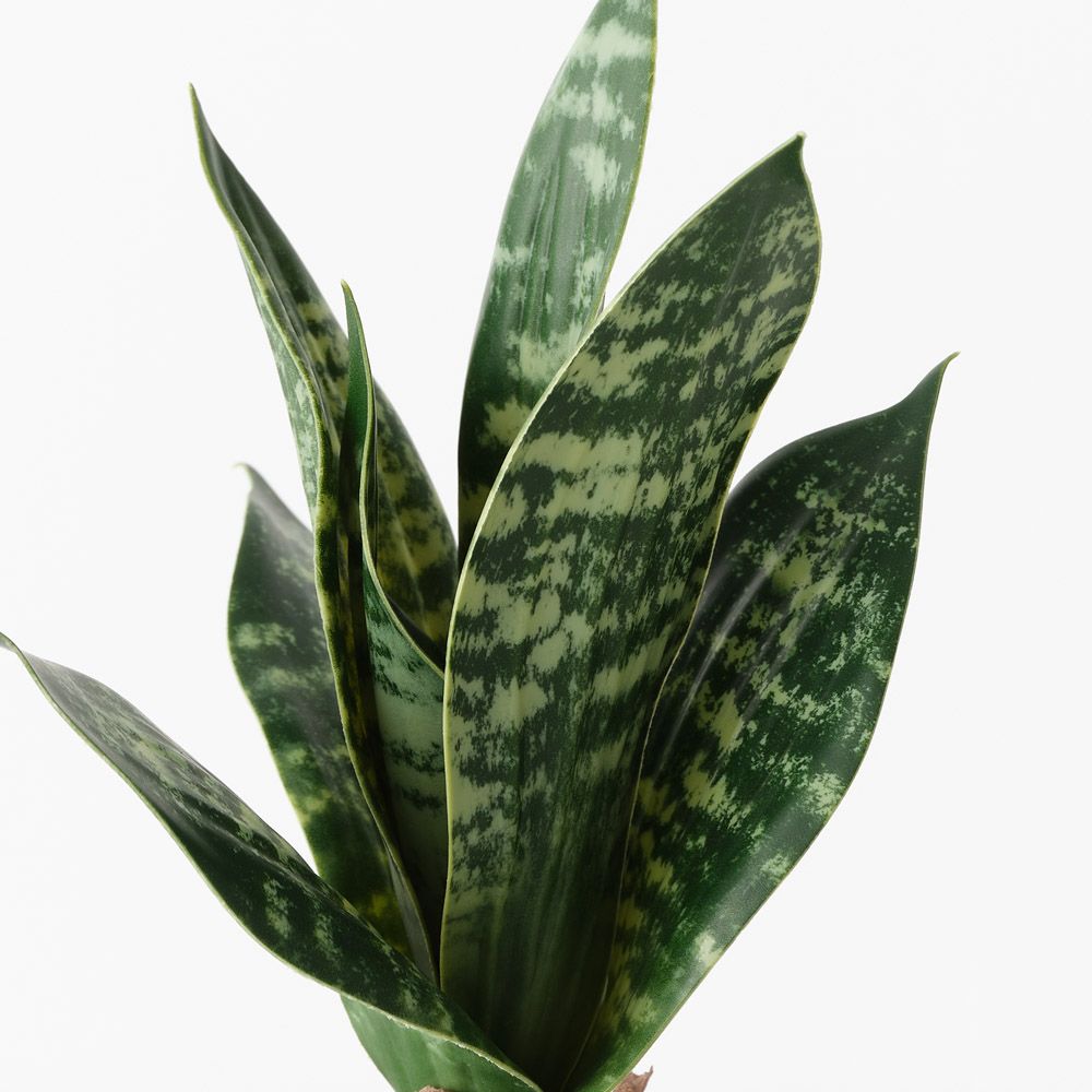 Introducing the Artificial Sansevieria Plant in a small pot. This realistic plant features the signature tall, upright leaves of the Sansevieria, with variegated green hues.