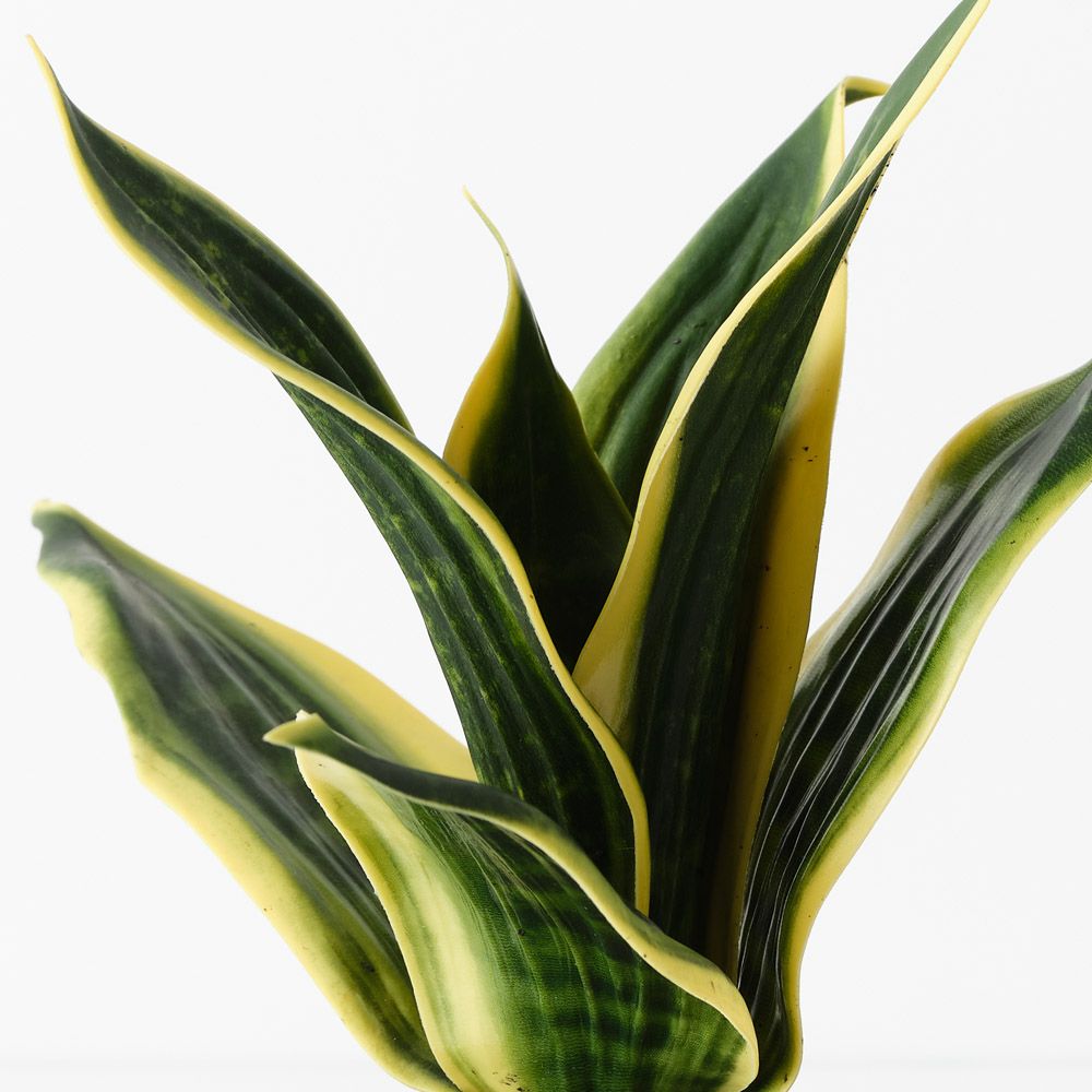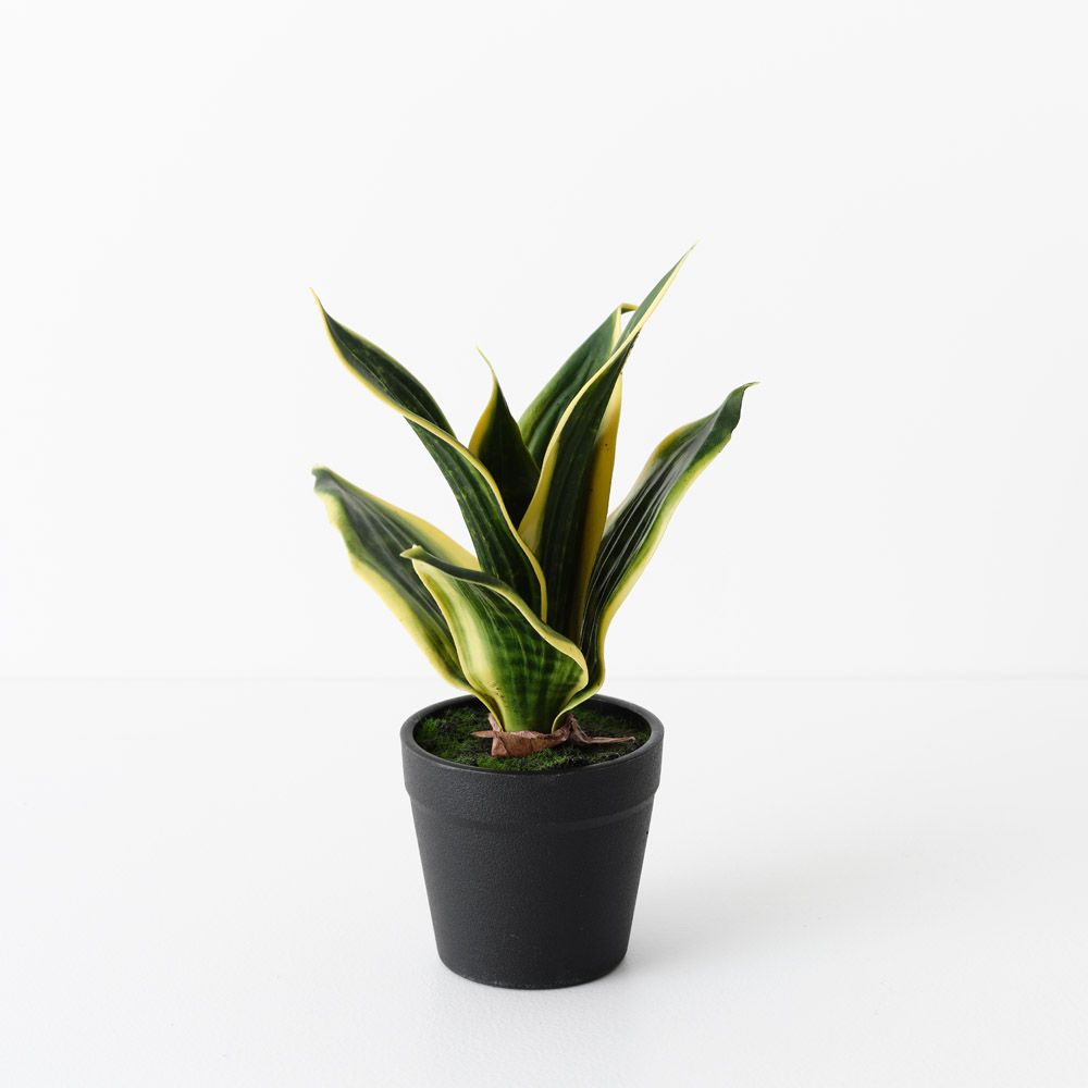 Introducing the Artificial Sansevieria Plant in a small pot. This realistic plant features the signature tall, upright leaves of the Sansevieria, with variegated green and yellow hues.