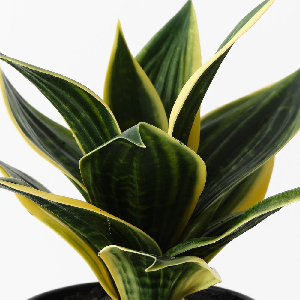 Introducing the Artificial Sansevieria Plant in a small pot. This realistic plant features the signature tall, upright leaves of the Sansevieria, with variegated green and yellow hues.