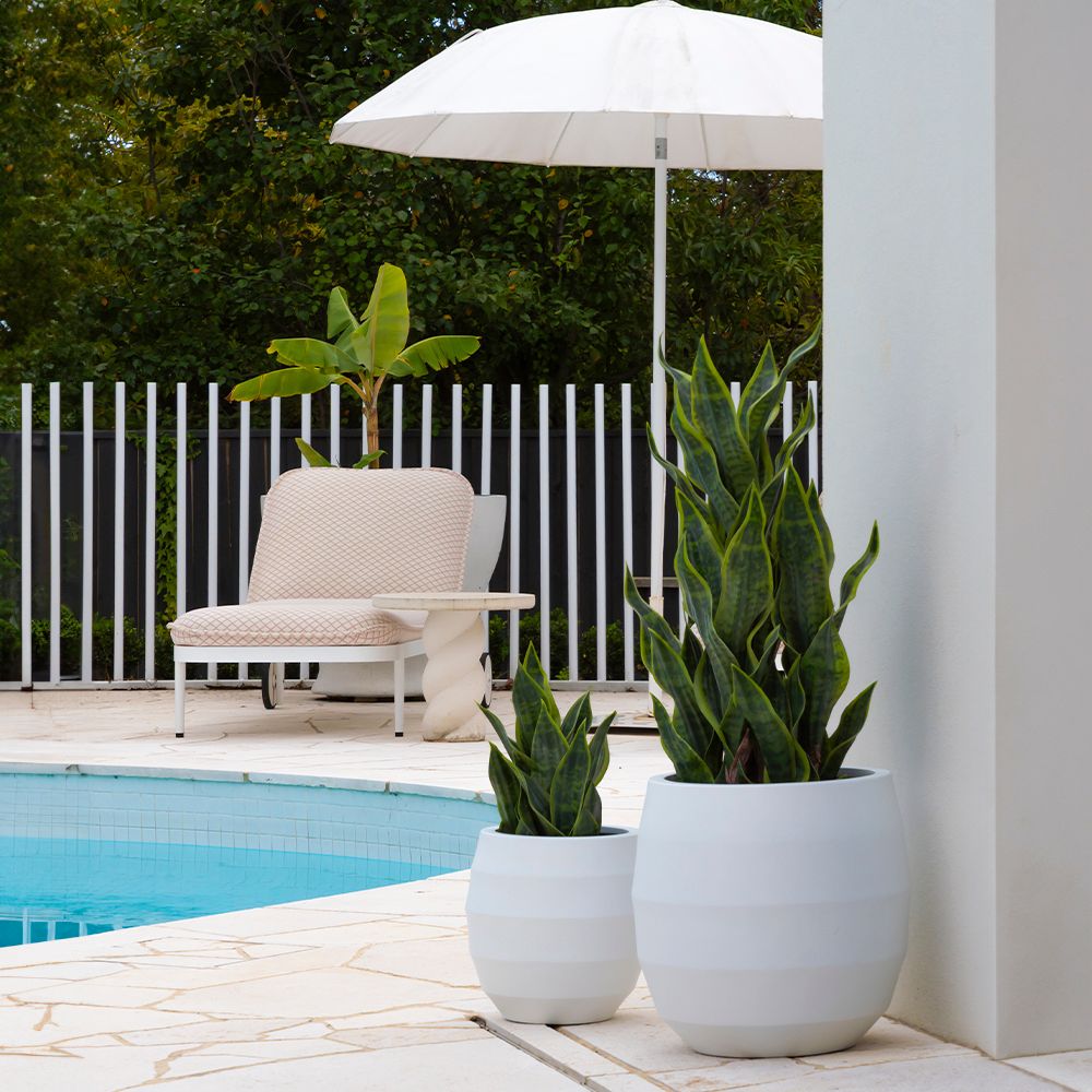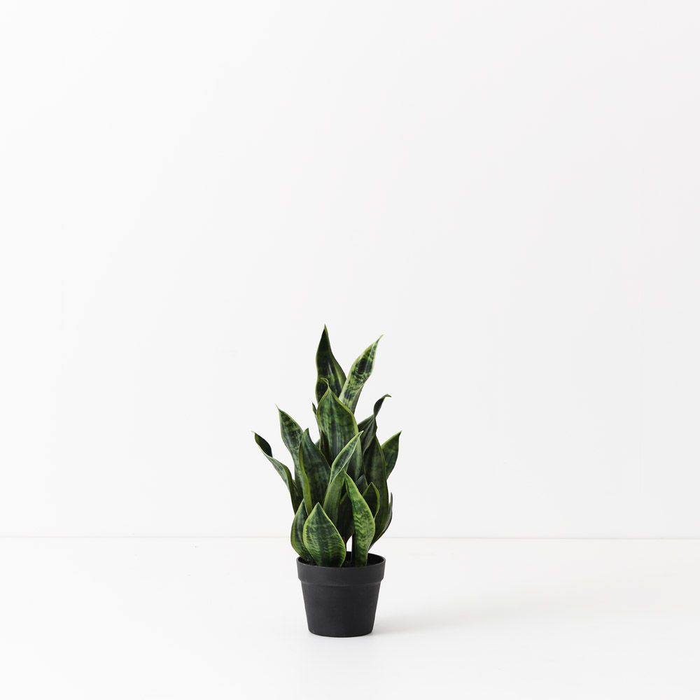 The Artificial Sansevieria Plant housed in a small black pot. This realistic plant features the signature tall, upright leaves of the Sansevieria, with variegated green hues. Its larger size makes it a striking piece of your home or workspace.
