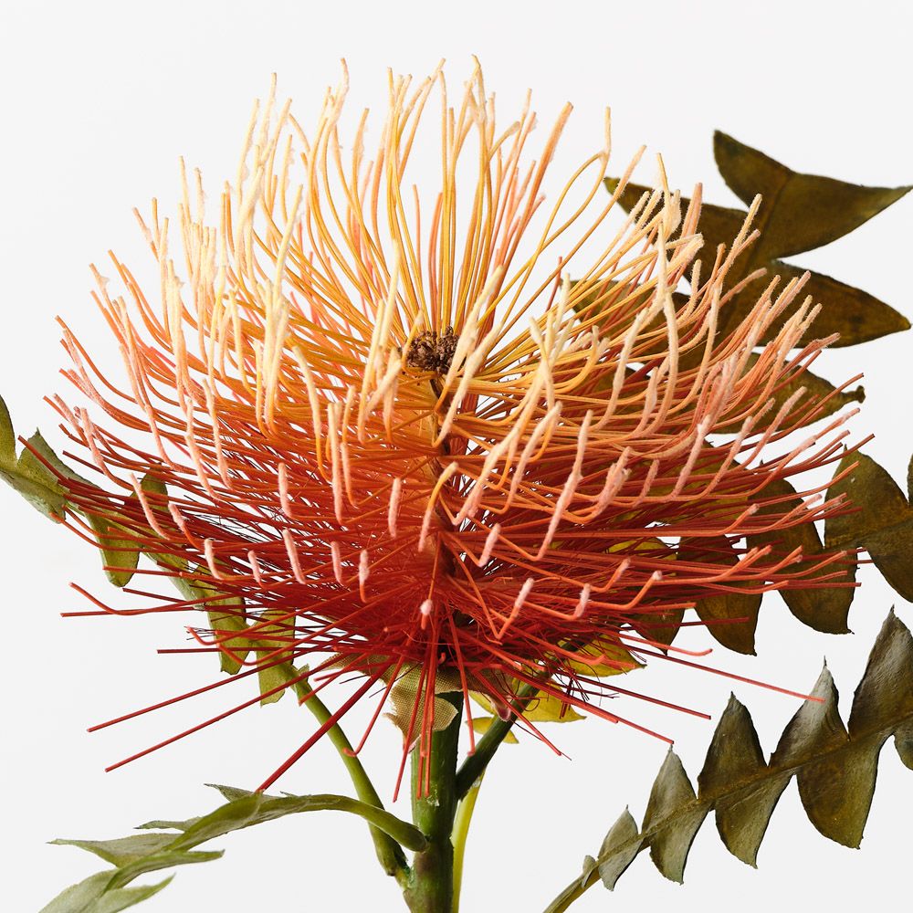 Introducing the Protea Leucospermum, a stunning floral stem featuring vibrant orange blooms. Known for its unique, pin-cushion-like appearance, this eye-catching flower adds a bold and exotic touch to any arrangement.