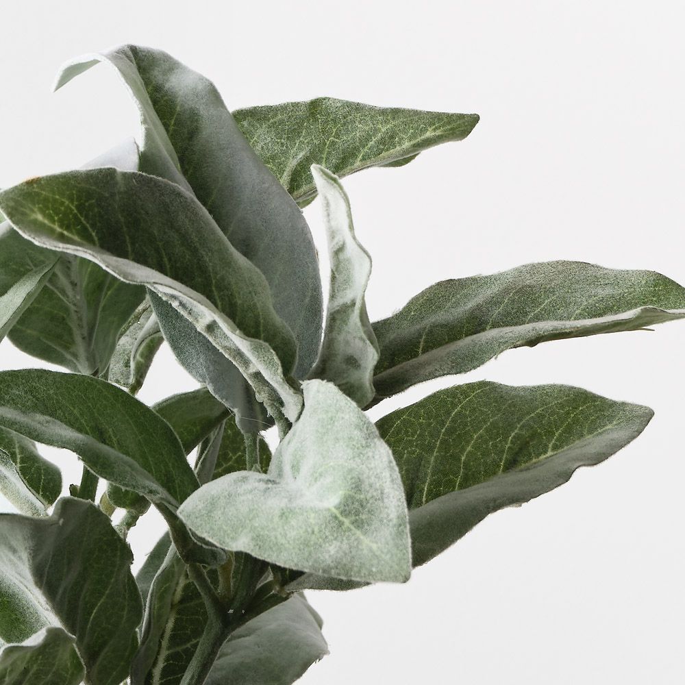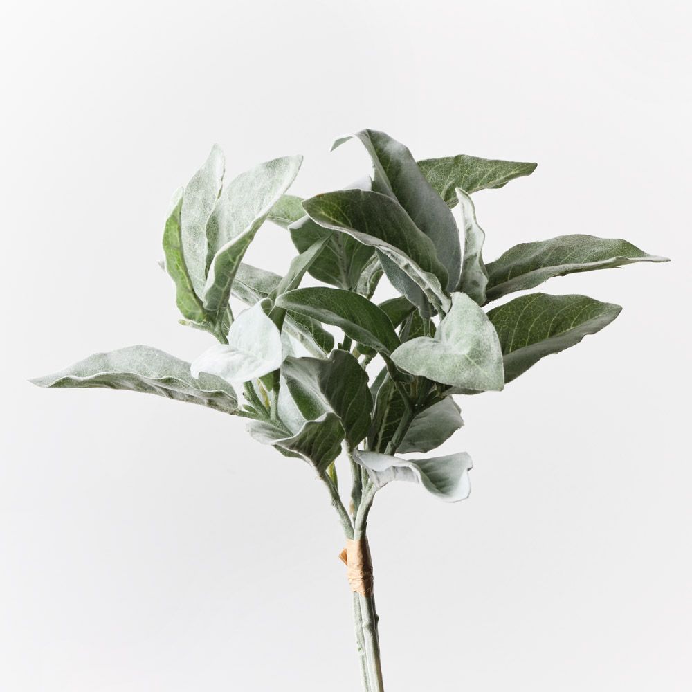 The artificial Lambs Ear Leaf Bouquet features soft, silvery-green leaves that mimic the fuzzy texture of real lamb's ear, adding a touch of elegance to any space.