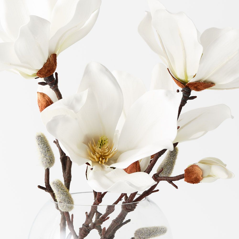 The Magnolia Japanese Mix in vase is a beautiful artificial arrangement featuring a blend of lifelike magnolia flowers. Perfect for adding a touch of elegance to any space, it offers the beauty of magnolias without the need for maintenance.
