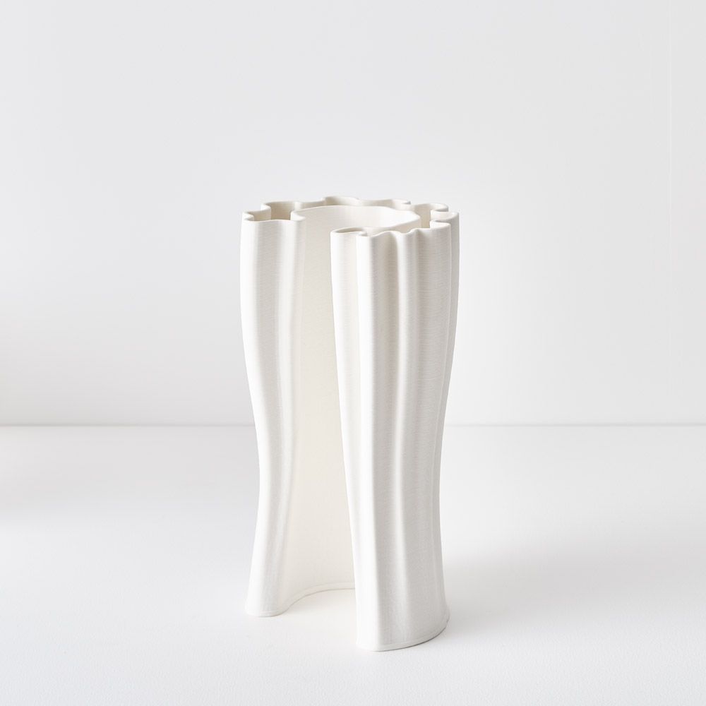 This 3D-printed vase features a unique horseshoe-shaped texture, adding a distinct and stylish touch. In ivory, it's perfect for faux flowers or as a striking decorative piece. For water use, add a small waterproof vessel inside.