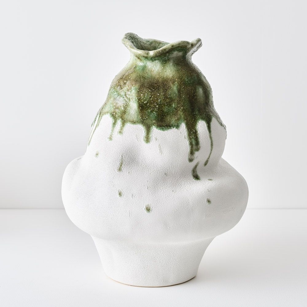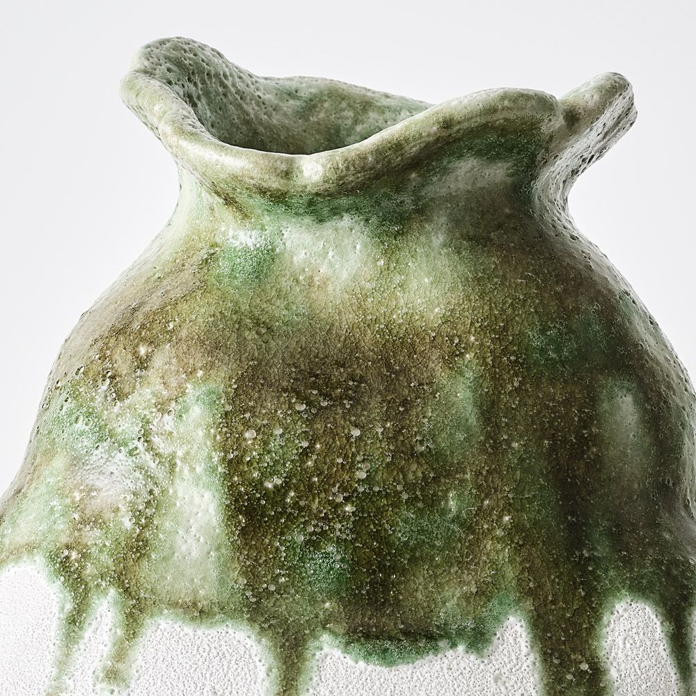 This white, hand-finished pot features an organic, cloud-like shape that widens from bottom to top. Its unique green moss-coloured glaze adds a touch of elegance, creating a dreamy and serene aesthetic.
