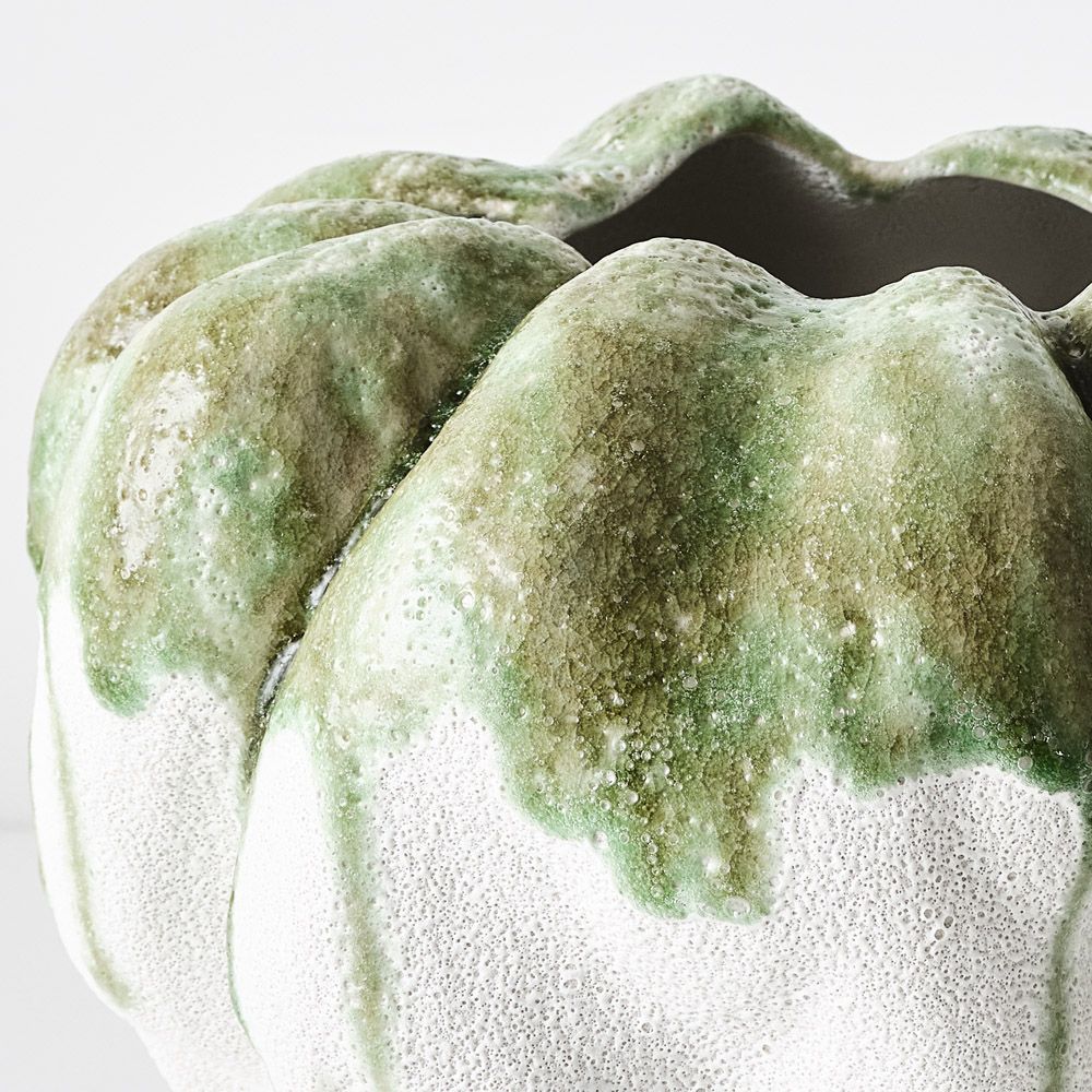 This white, hand-finished pot boasts an organic shape that gracefully widens as it nears the opening. It is adorned with a unique green moss-coloured glaze that flows naturally over the surface, adding a touch of elegance and character.