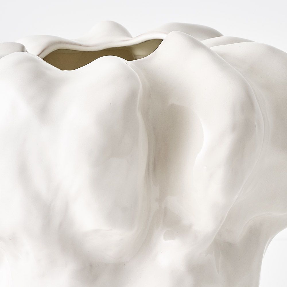 This white, hand-finished pot features an organic, cloud-like shape that widens from bottom to top. Its sleek glazed finish adds a touch of elegance, creating a dreamy and serene aesthetic.