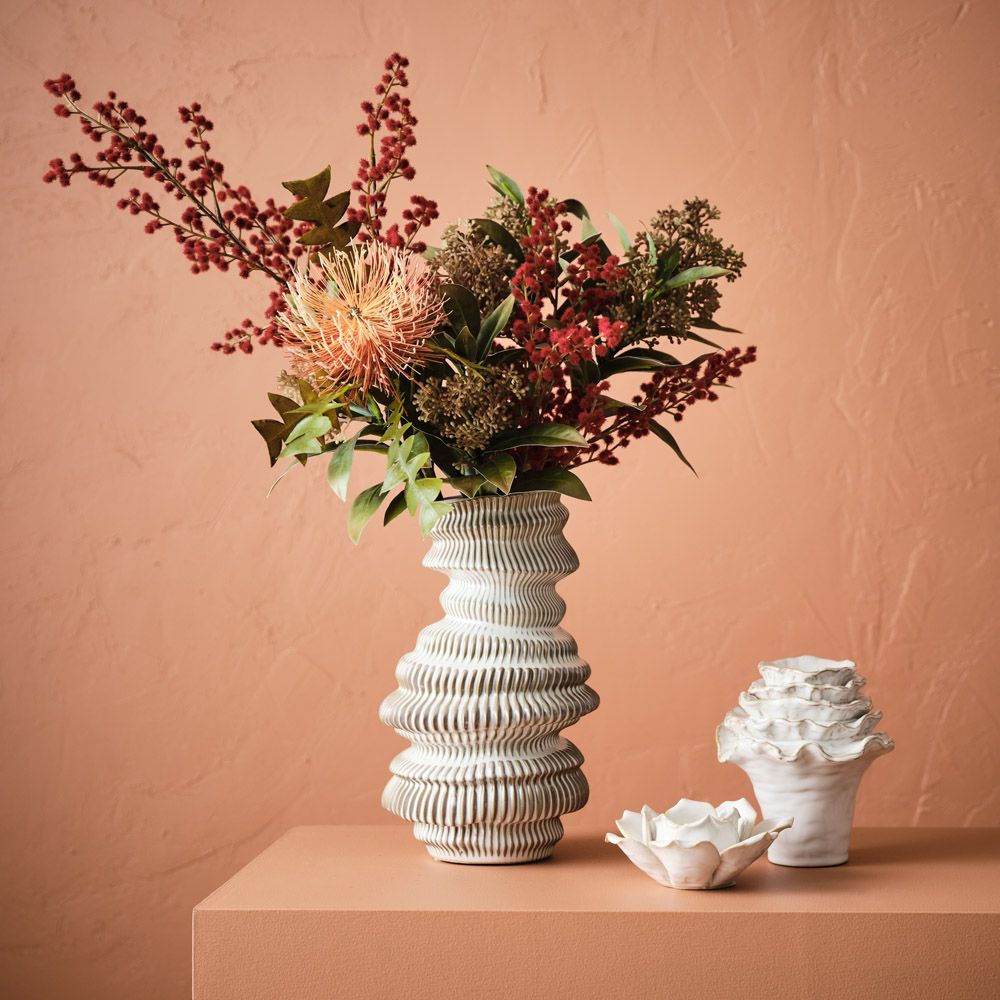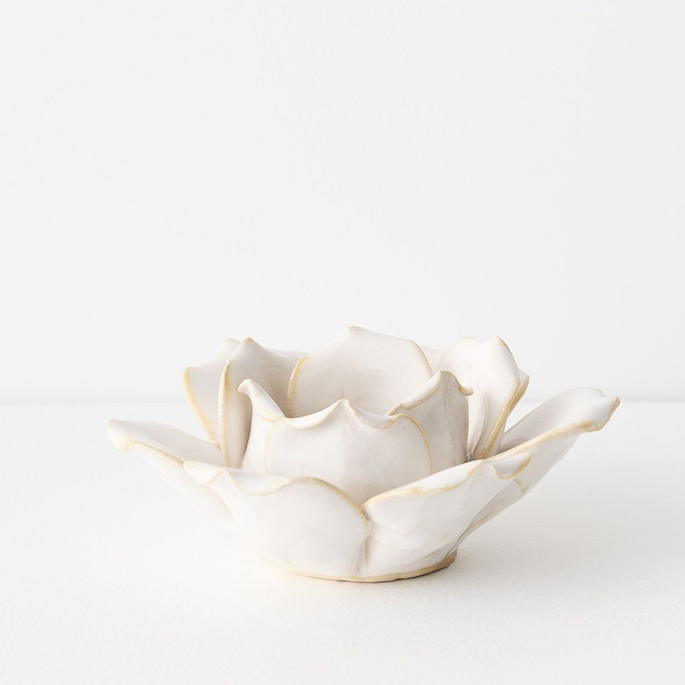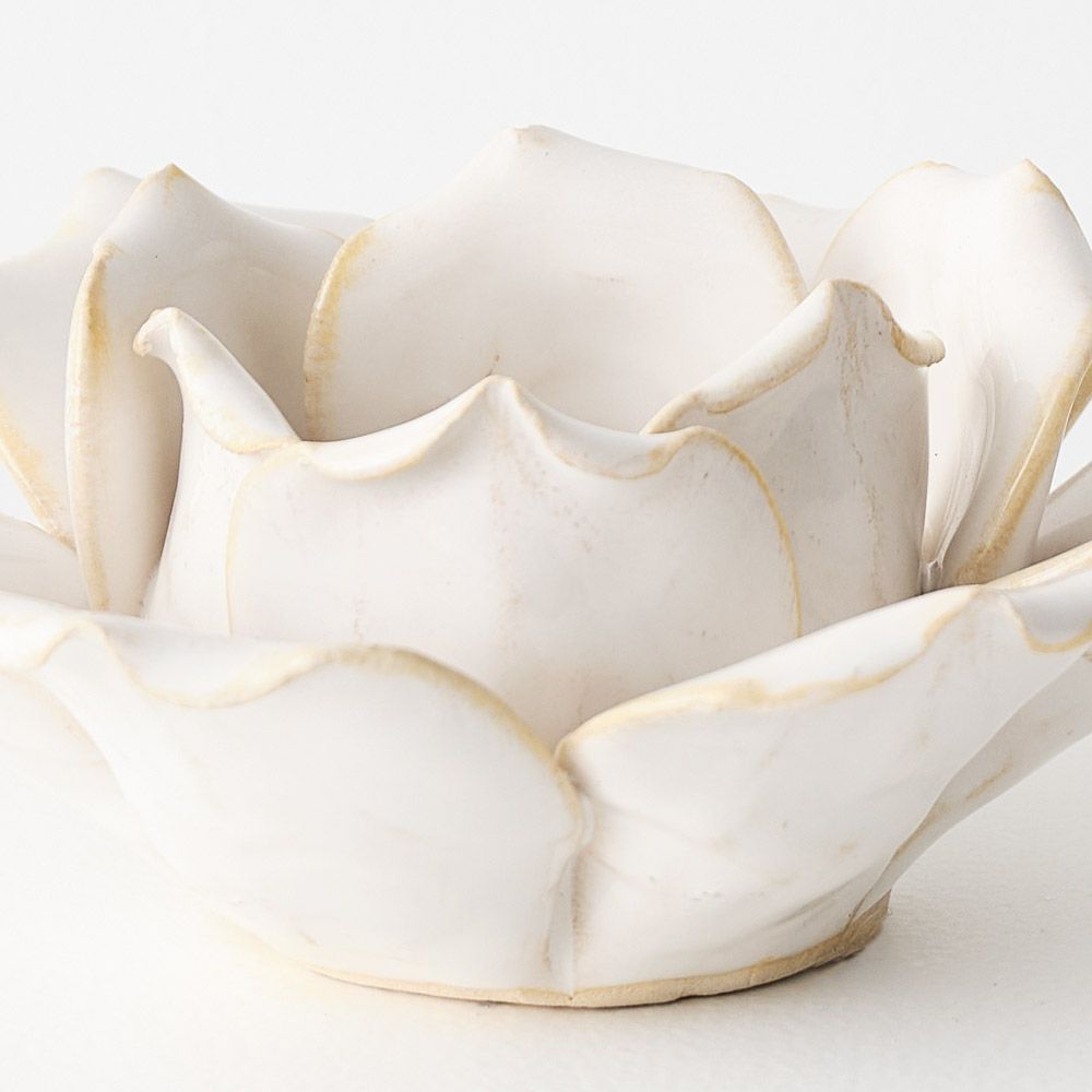 This candle holder is designed to resemble a blossoming flower, with petal-like structures radiating outward. The soft, off-white ceramic finish gives it a serene and elegant look, perfect for adding a warm, natural ambiance to any room.