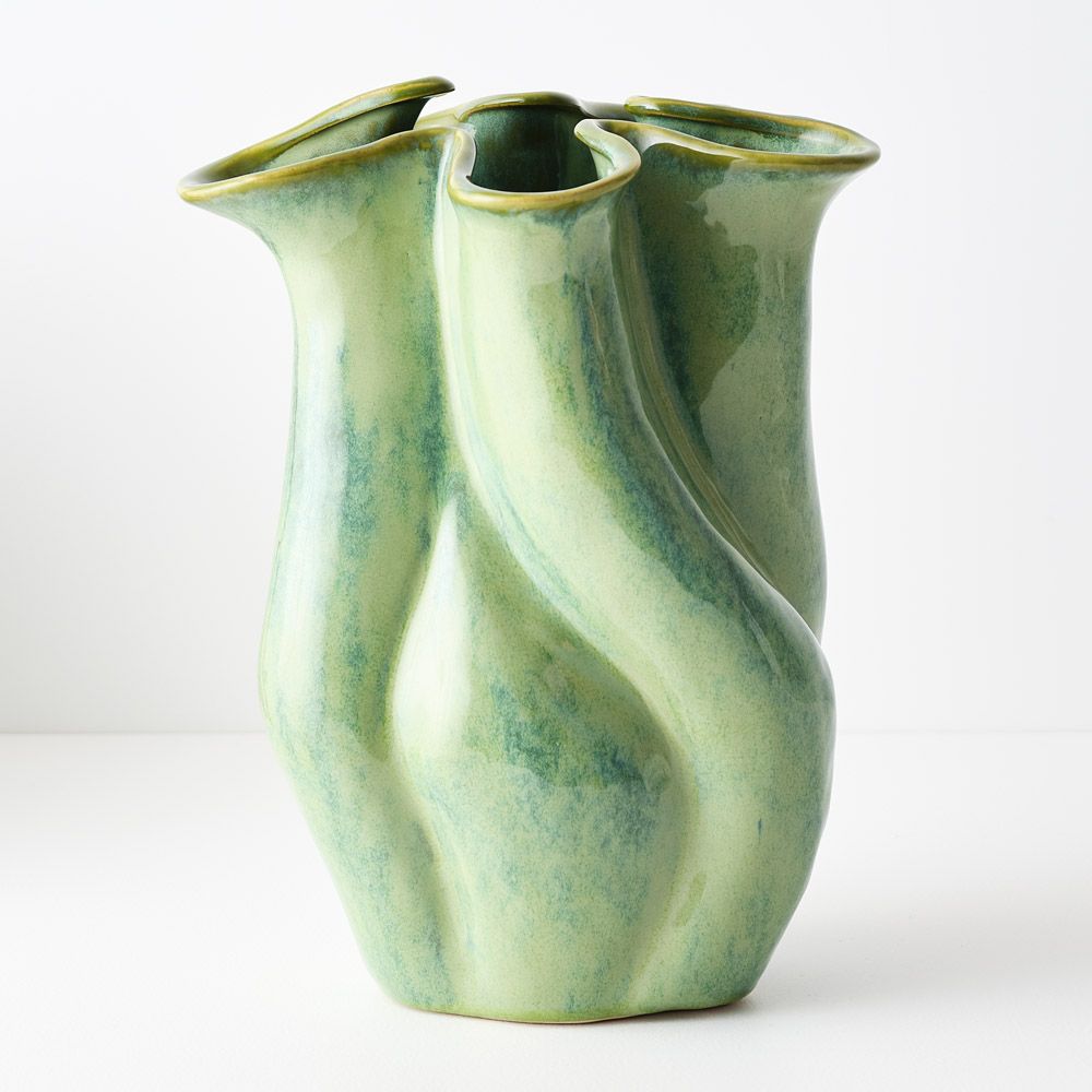 The striking basil Neva Vase features a stunning hand-finished glaze, making it a beautiful decorative piece. Its design is perfect for displaying stems, adding a touch of elegance to any room.