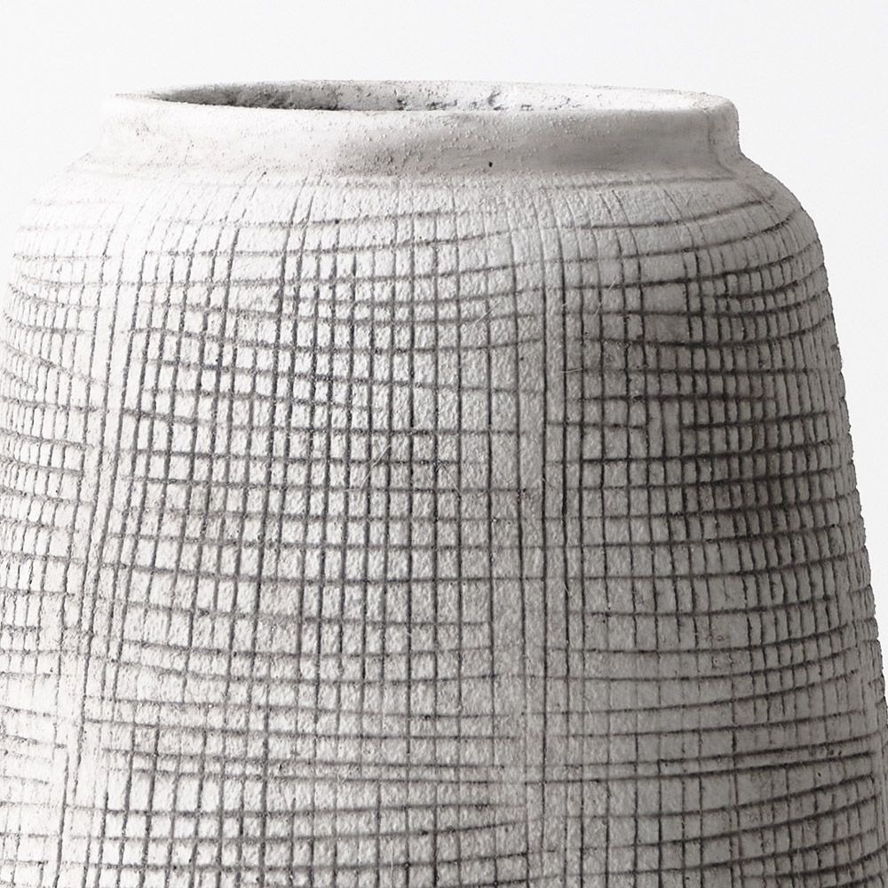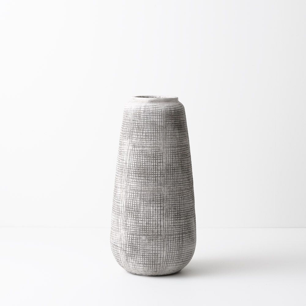 The tall Eames Outdoor Vase, with its crosshatched pattern scored into the surface, is ideal for thinner plants or as an impressive decorative piece. It includes a drainage hole for optimal plant health, combining both functionality and style.
