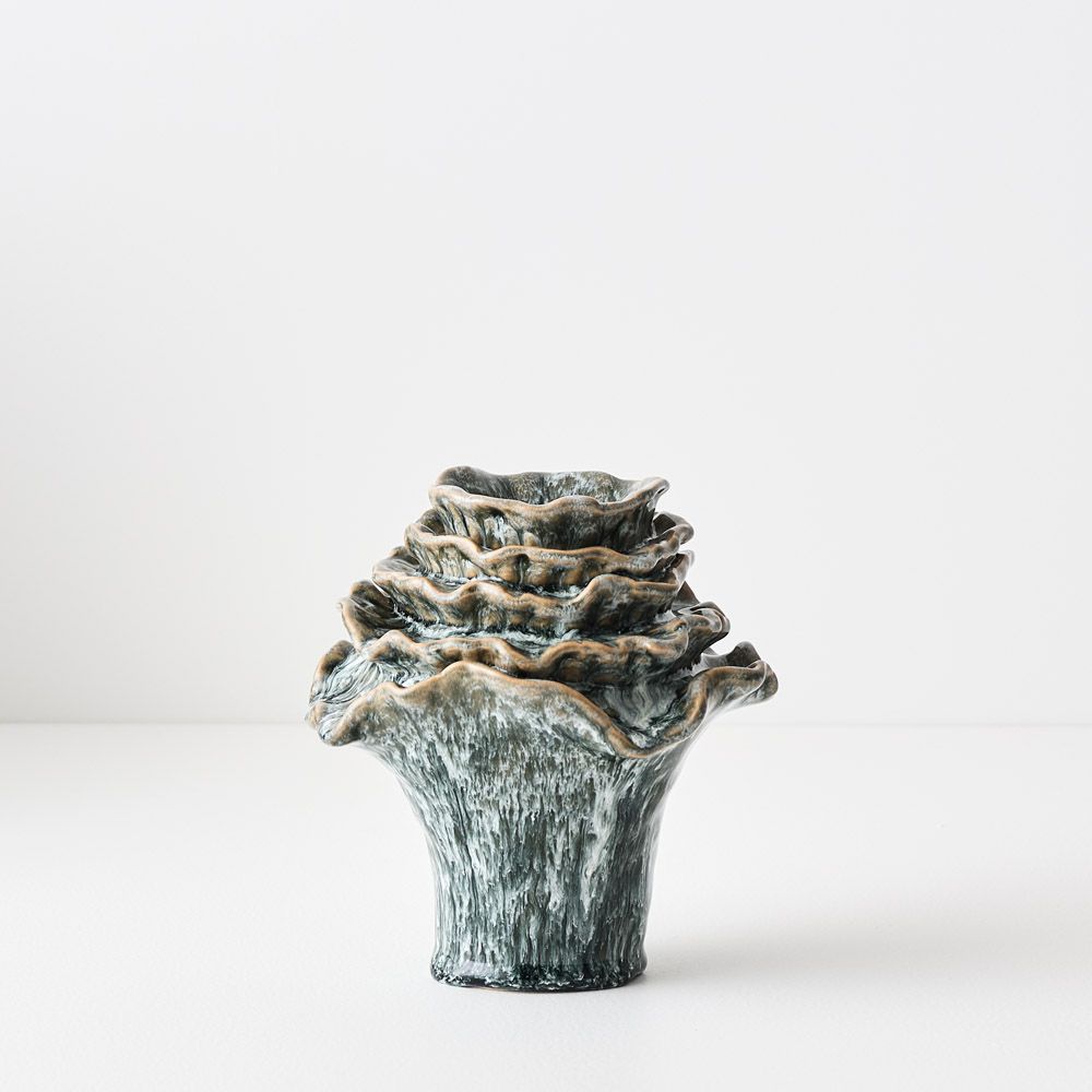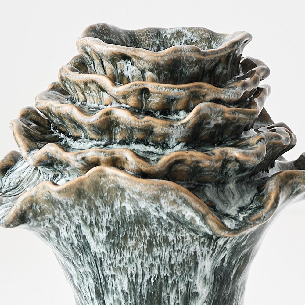 This ceramic vase showcases a multi-layered, ruffled design resembling delicate coral or sea life. Its dark, marbled glaze with earthy tones adds a dramatic touch, making it an eye-catching centrepiece for any contemporary or coastal-inspired decor.