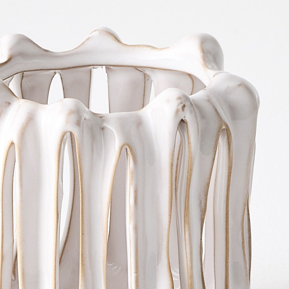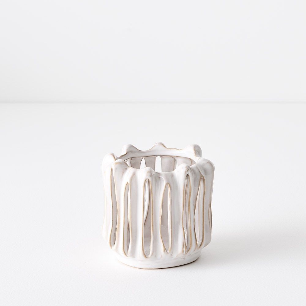 The Smallest of the Claudia ceramic lantern. It features linear peep holes that allow soft light to escape, creating a warm and inviting ambiance. Perfect for Christmas decor or indoor-outdoor entertainment, it adds a touch of elegance to any setting.
