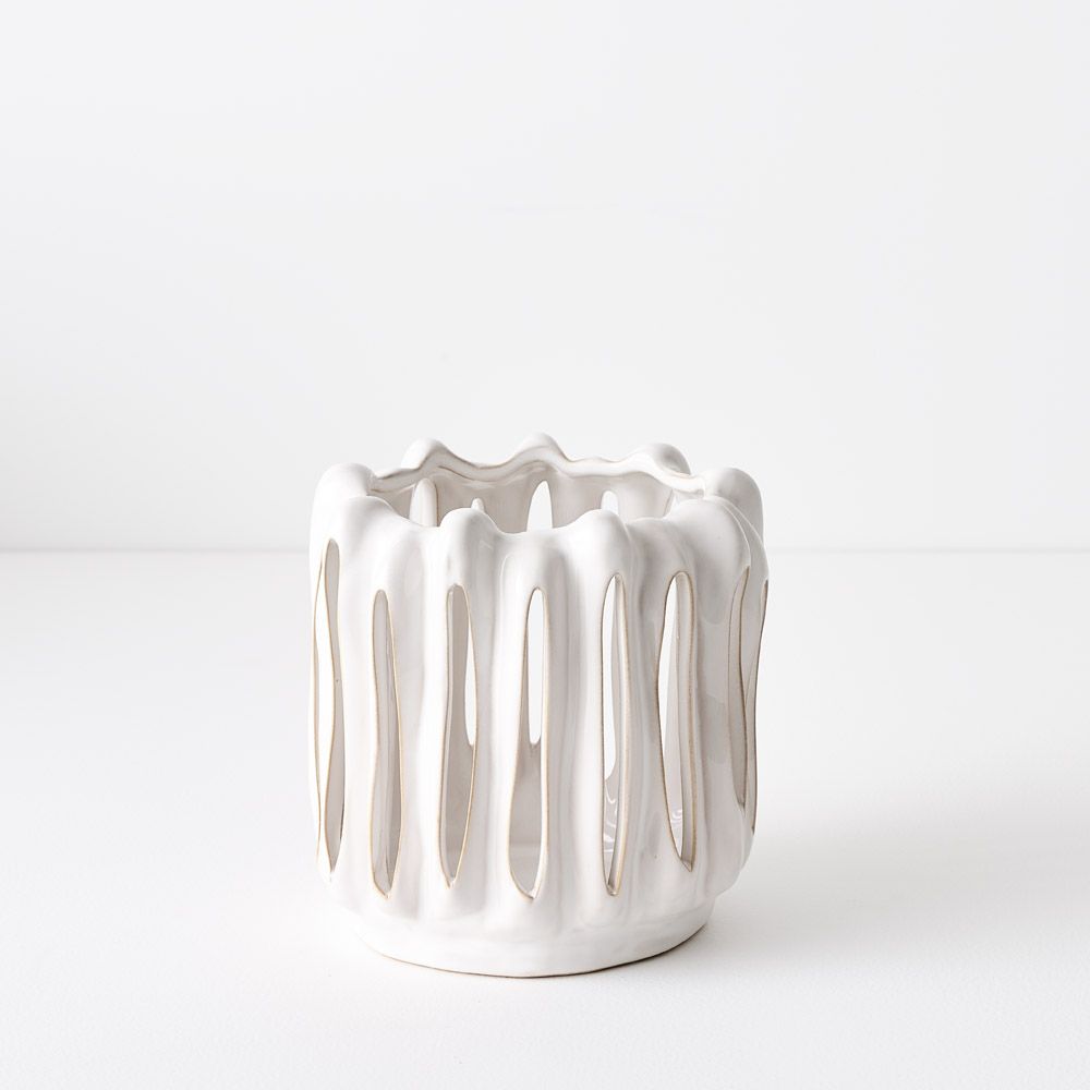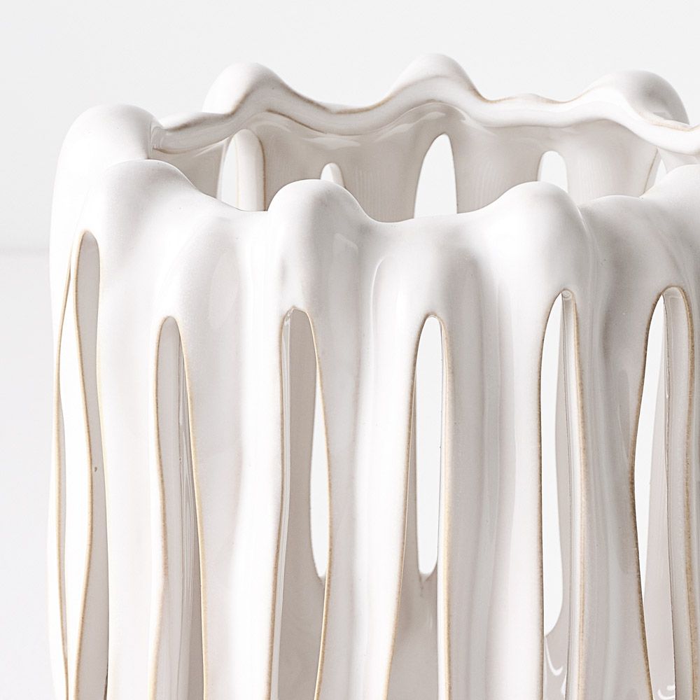 The Claudia ceramic lantern features linear peep holes that allow soft light to escape, creating a warm and inviting ambiance. Perfect for Christmas decor or indoor-outdoor entertainment, it adds a touch of elegance to any setting.