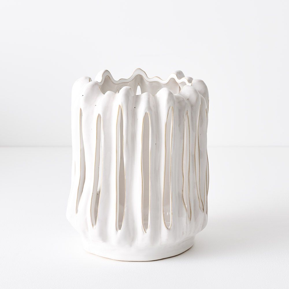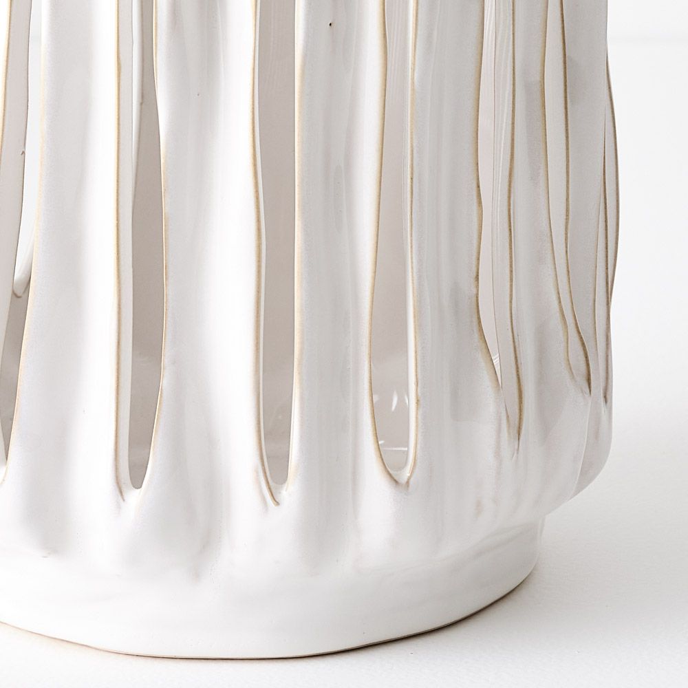 The Claudia ceramic lantern features linear peep holes that allow soft light to escape, creating a warm and inviting ambiance. Perfect for Christmas decor or indoor-outdoor entertainment, it adds a touch of elegance to any setting.