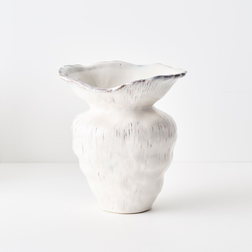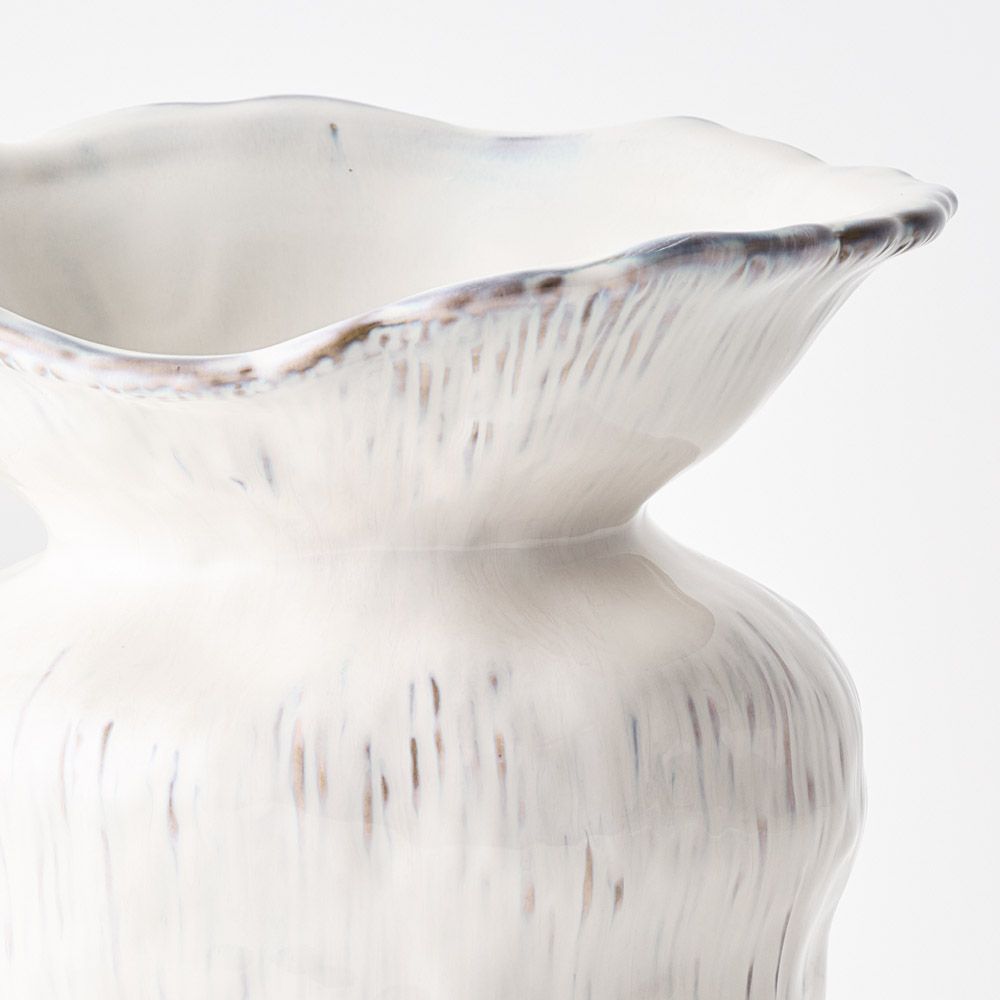 This ceramic vase features a textured, organic design with a wavy rim. The off-white glaze is subtly distressed, giving it a rustic yet modern feel. Perfect as a standalone piece or for displaying flowers.