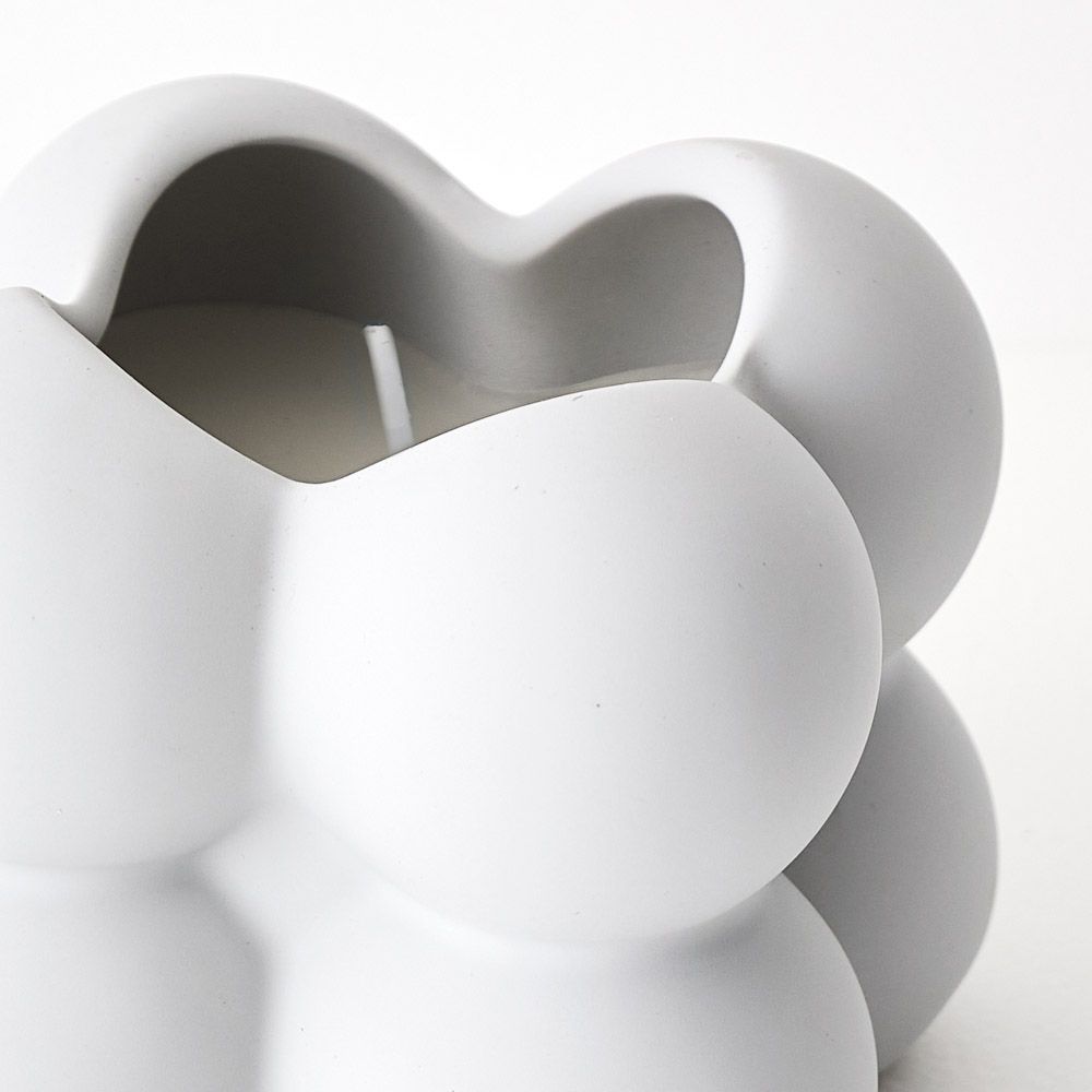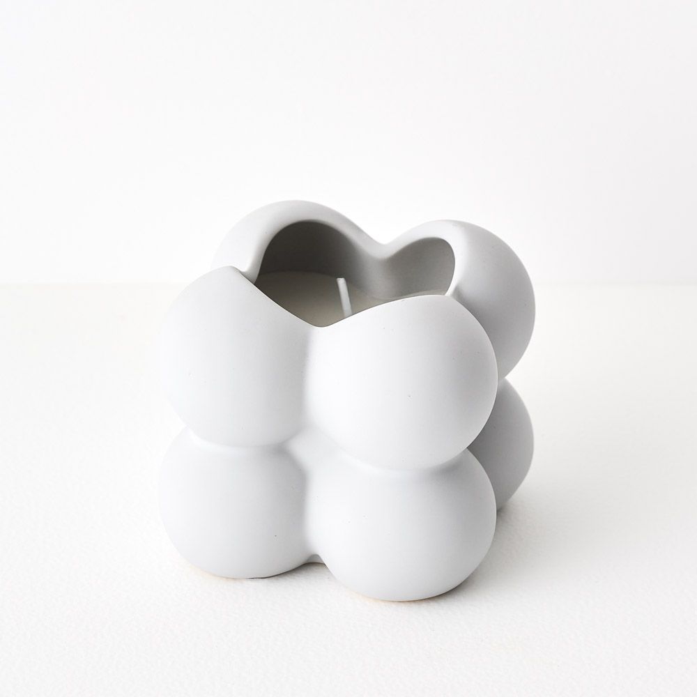 This hand-poured candle is nestled in a uniquely designed ceramic pot, featuring a modern, cloud-like cube shape. This candle is fig scented.