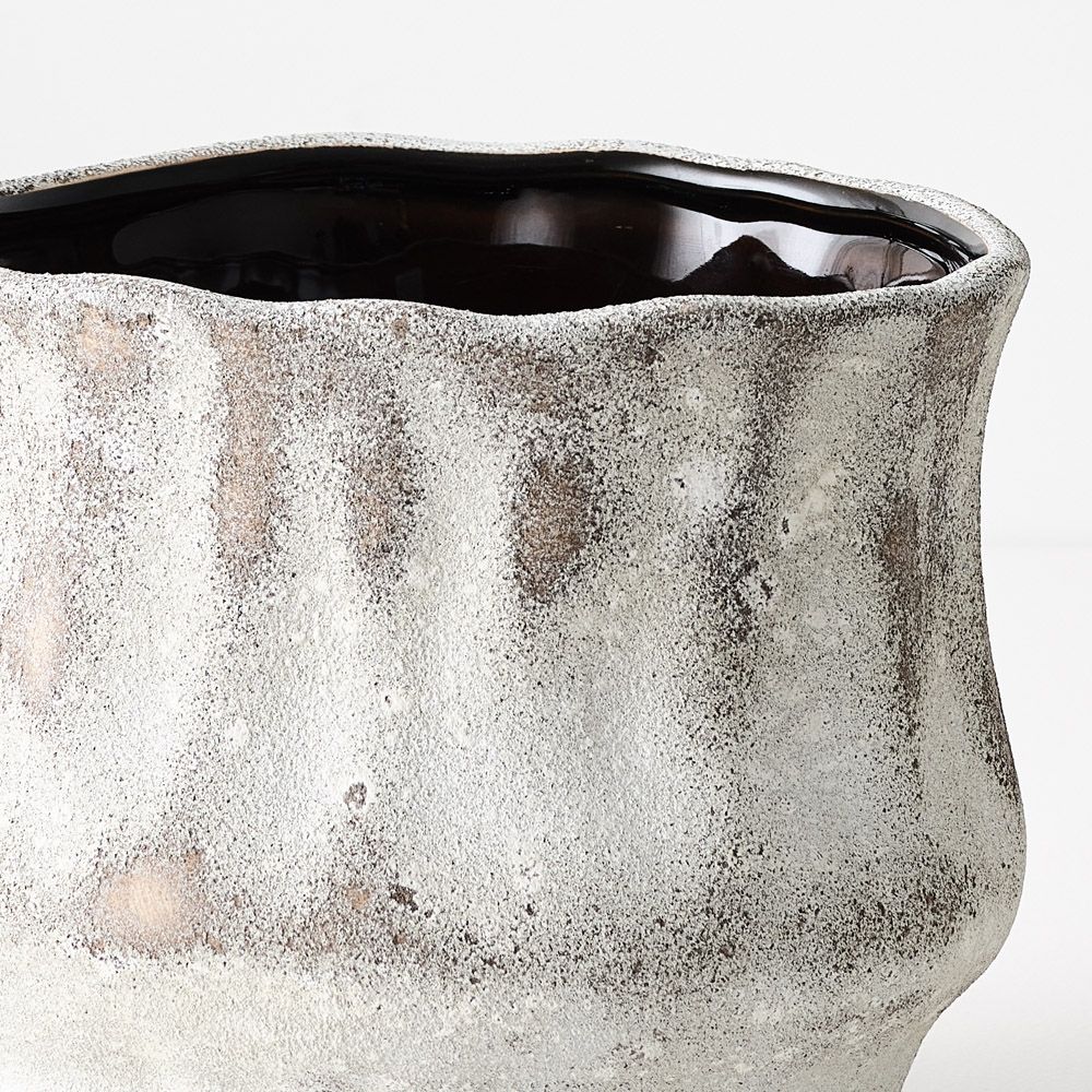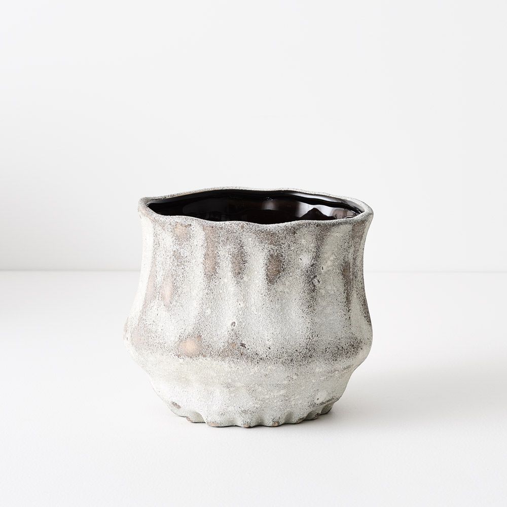 This little, squat pot is ideal for small plants. Its compact design and sturdy build make it a practical choice for showcasing delicate greenery or as a charming decorative piece.