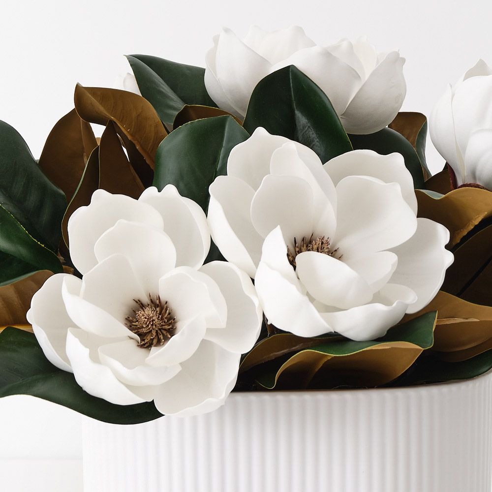 This arrangement of Japanese Magnolia features exquisite white magnolia blooms set against a beautifully designed oval pot with subtle linear detailing. Its modern, sophisticated style complements the lush, lifelike flowers, making it an elegant addition to any decor, perfect for enhancing both contemporary and classic interiors.