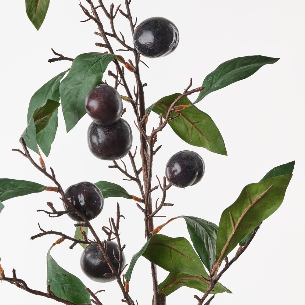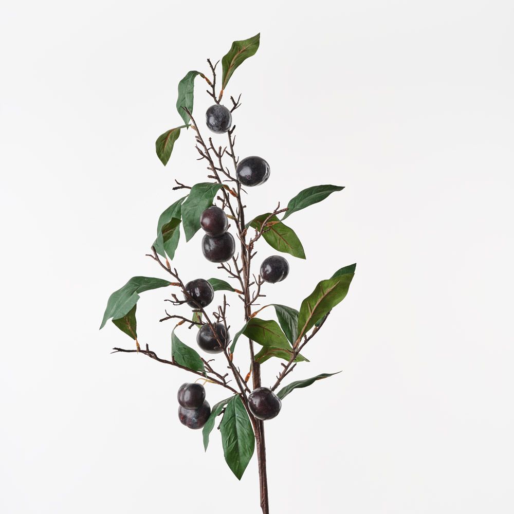The rich plum spray is loaded with vibrant purple plums, paired with lush, detailed foliage. The abundance of fruit and greenery creates a full, striking display that adds richness and depth to any arrangement. Perfect for bringing a burst of colour and natural beauty to your decor.