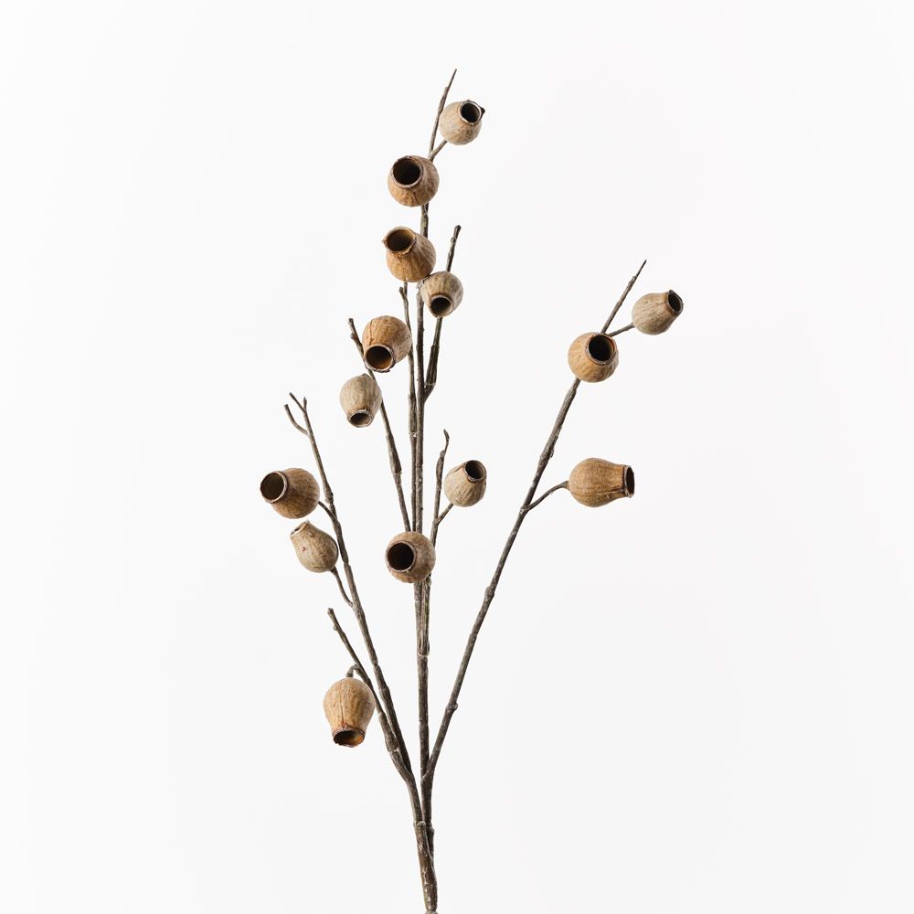 The Eucalyptus Pod Spray features a dried, natural look with rich brown tones, reminiscent of pods found at the base of a eucalyptus tree. Its authentic design and textured appearance make it perfect for creating rustic or earthy arrangements.
