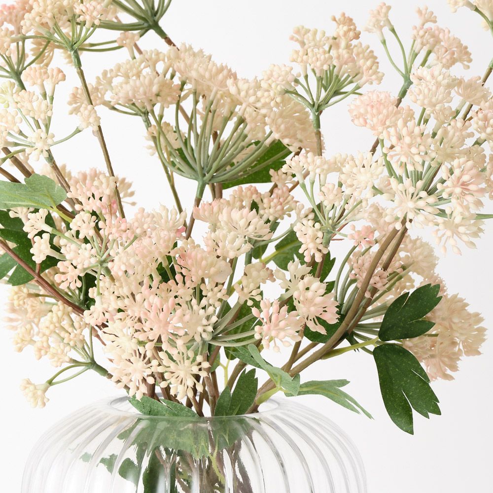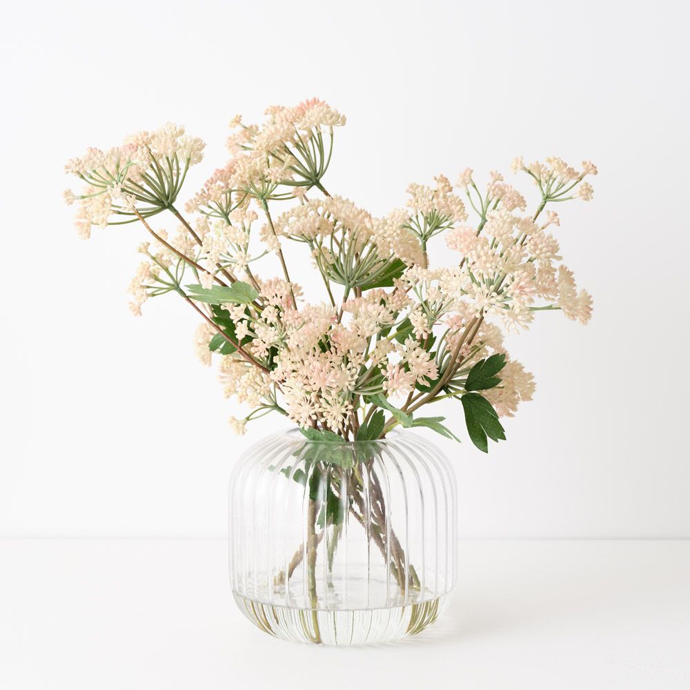 The Angelica Mix features a delicate arrangement of cream and pink-coloured Queen Anne’s Lace, elegantly displayed in a fluted glass vase. Perfect for adding a touch of charm to any space.