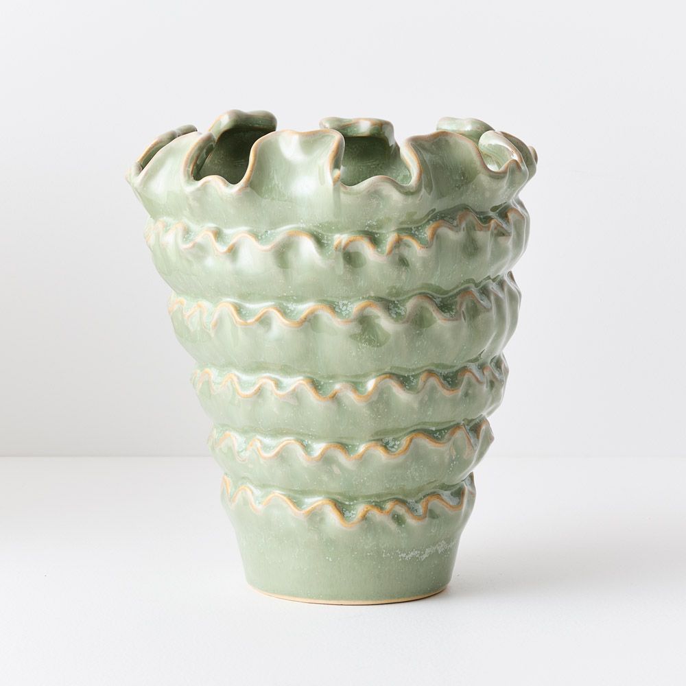 The Zenika Pot stands out with its sculptural ridged design. The unique ruffled top and layered texture create a bold, contemporary statement piece. Perfect for displaying tall stems or as a striking standalone décor item that adds depth and drama to any setting.