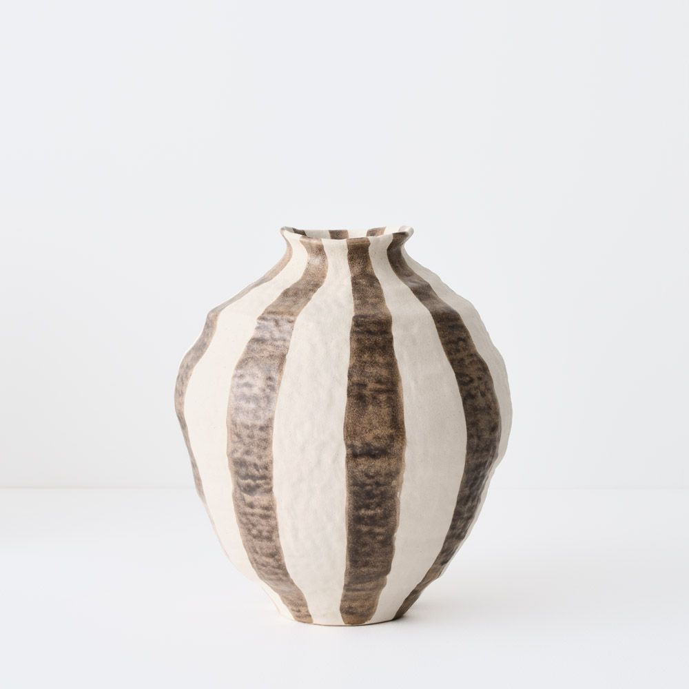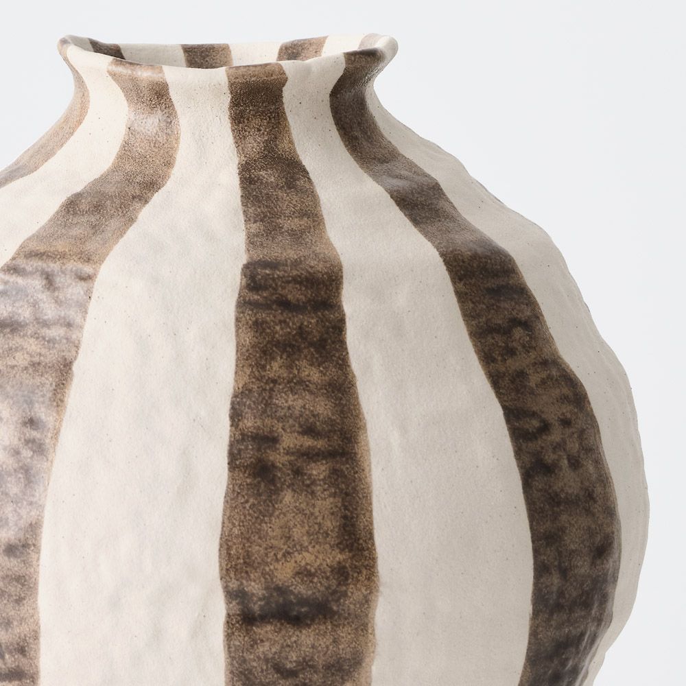 An organically shaped pot featuring brown-toned linear strip details and a beautifully textured finish. A subtle yet striking piece for adding natural warmth and character to any space.