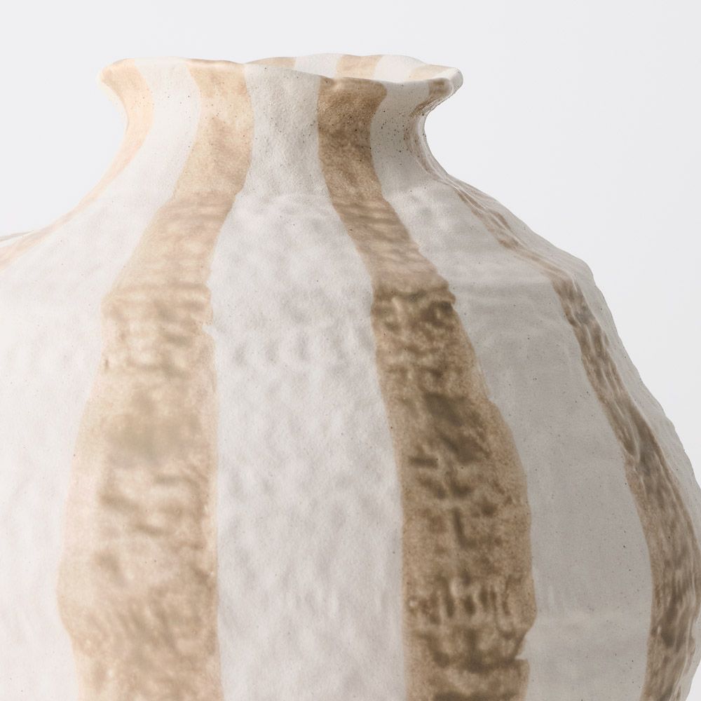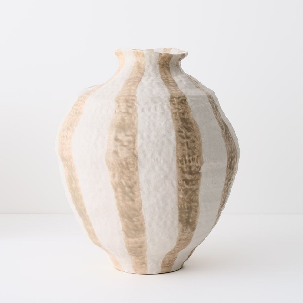 An organically shaped pot featuring sand-toned linear strip details and a beautifully textured finish. A subtle yet striking piece for adding natural warmth and character to any space.