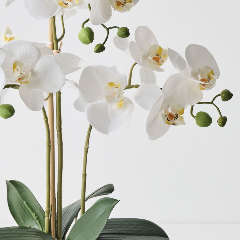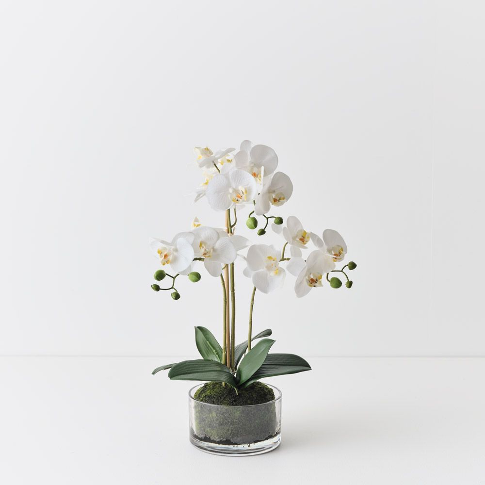 A stunning Orchid Phalaenopsis elegantly presented in a sleek bowl, combining beauty and simplicity. This piece creates an instant focal point with its smooth curves and refined blooms, ideal for tabletops or shelves.