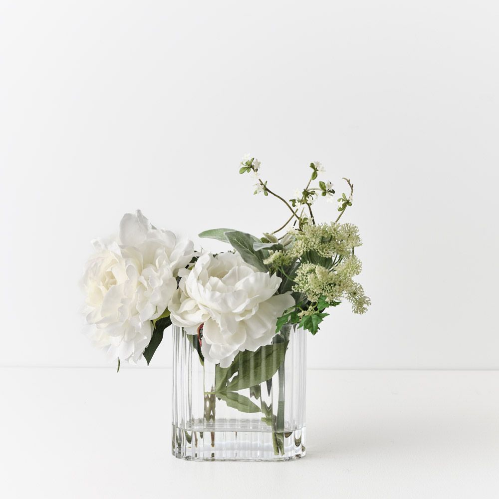 A beautiful blend of soft peonies and wispy willow branches, arranged in a clear glass vase. This mix combines fullness with airy elegance, creating a fresh and romantic display perfect for any setting.