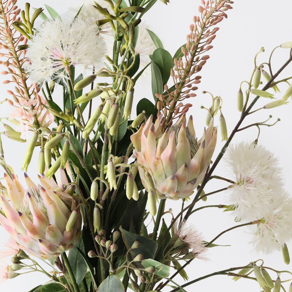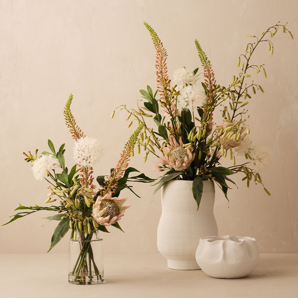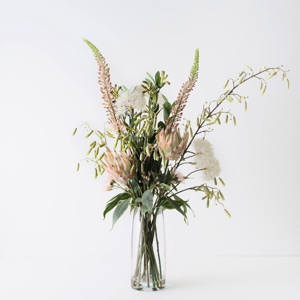 The Dandelion Protea Mix in a clear glass vase combines airy dandelion blooms with bold, sculptural protea flowers for a striking, textured display. Perfect for adding natural elegance and modern charm to any interior. Brighten your space with Floral Interiors.
